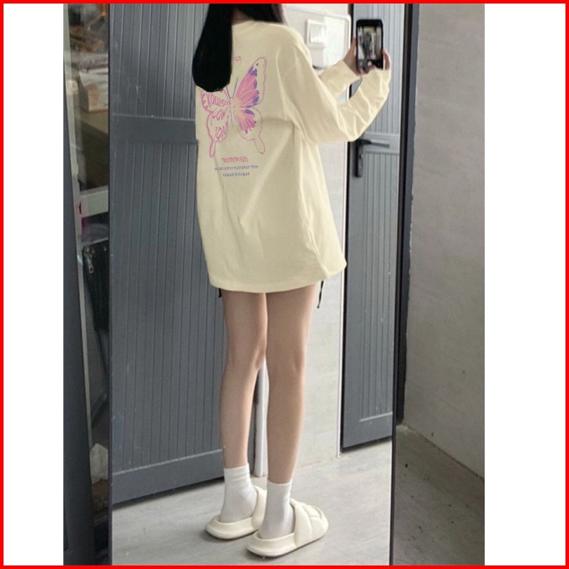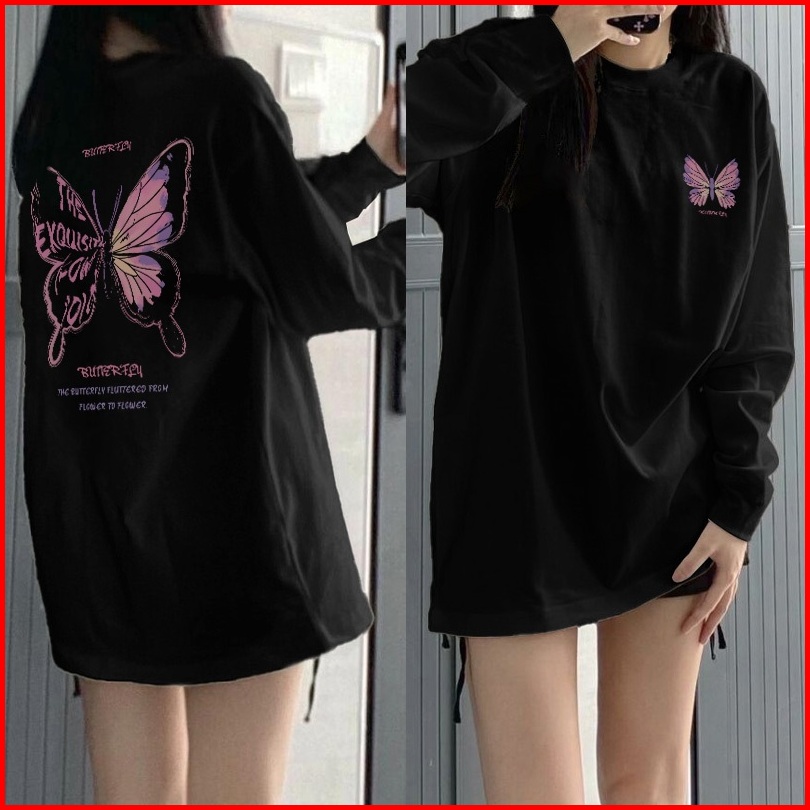 Kaos Oversize Lengan Panjang Wanita Cetakan Pink Butterfly Baju Kaos Lengan Panjang Wanita Terbaru Kekinian Baju Kaos