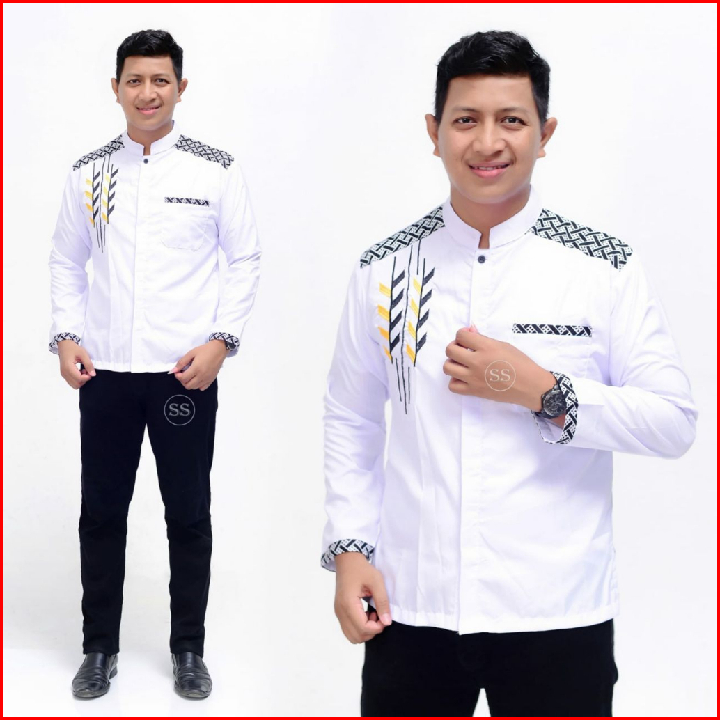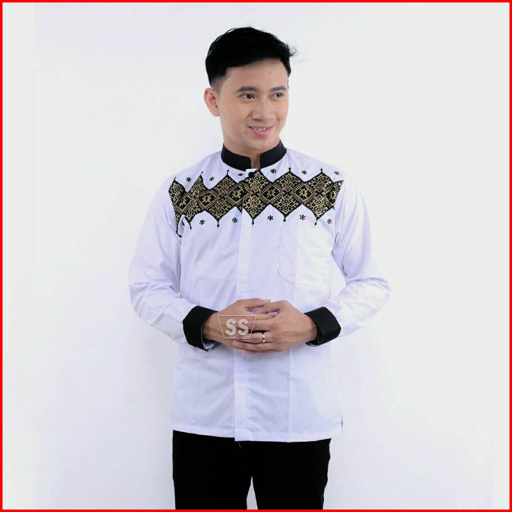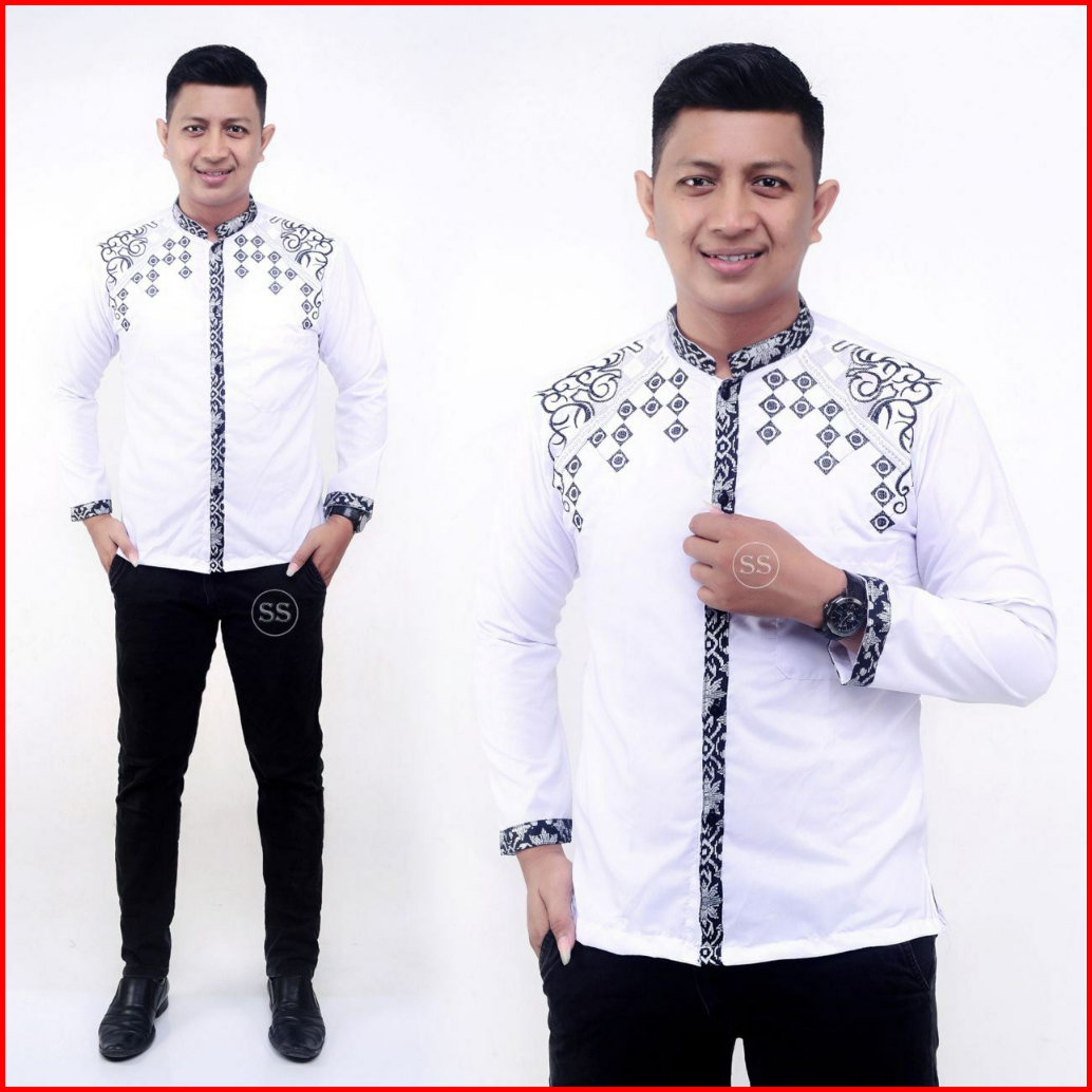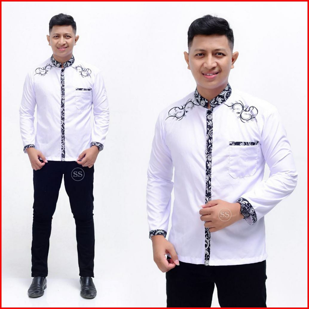 Nazilla Batik - Baju Koko Muslim Putih Kombinasi Batik Pria Lengan Panjang Terbaru