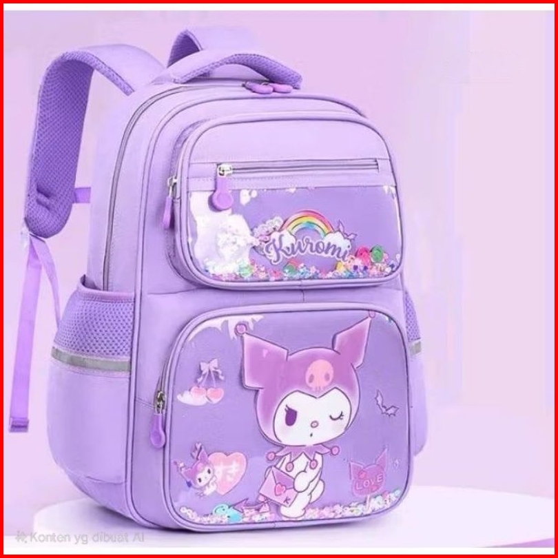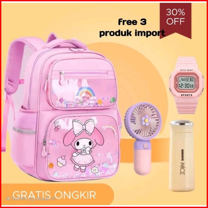 Tas Sekolah Anak Perempuan Karakter Kuromi Mika Gratis Kipas Portable Botol Minum Dan Jam Tangan