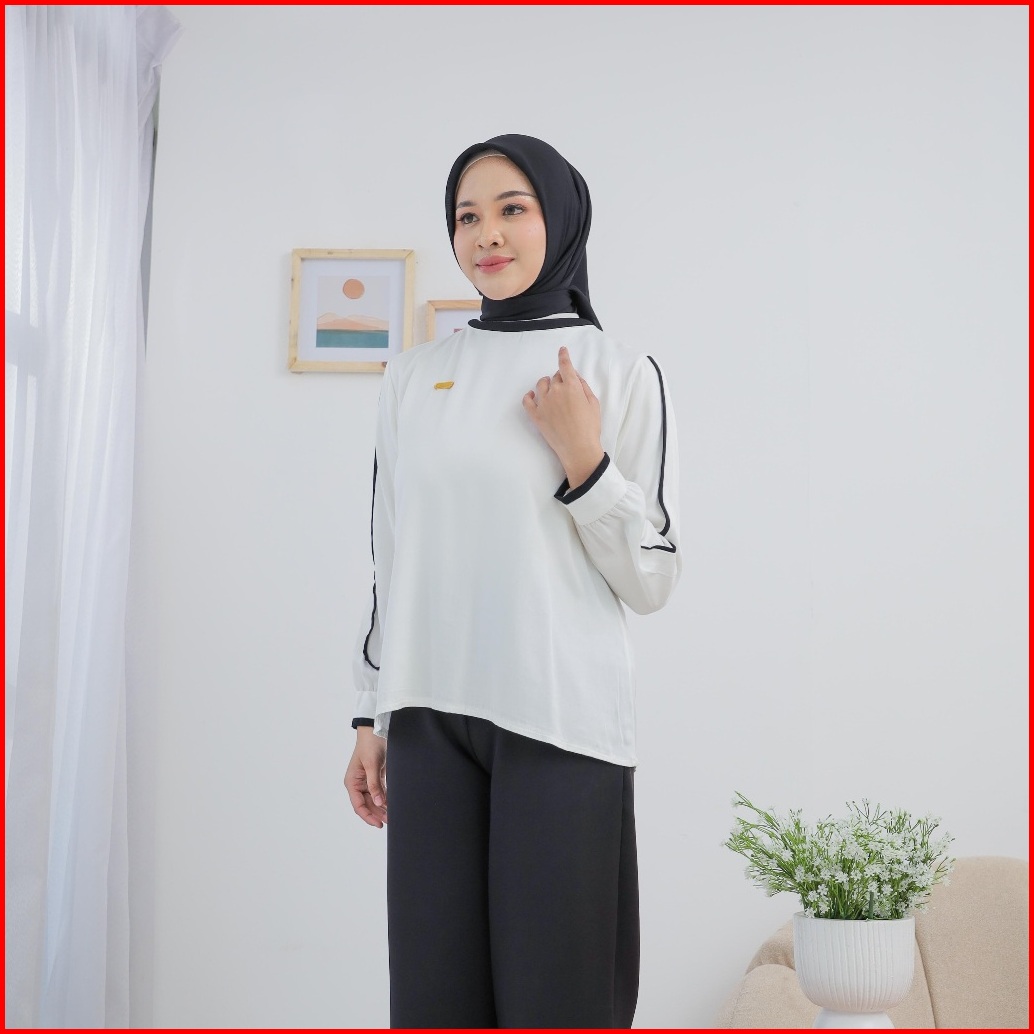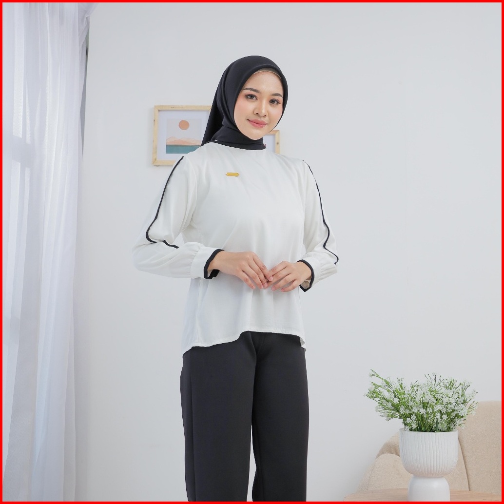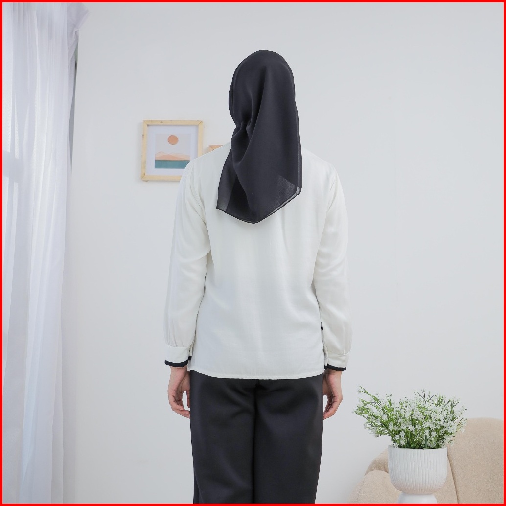 Sse Olshop - Blouse Lotus Atasan Putih Wanita List Hitam Kasual Bahan Rayon Twill Terbaru