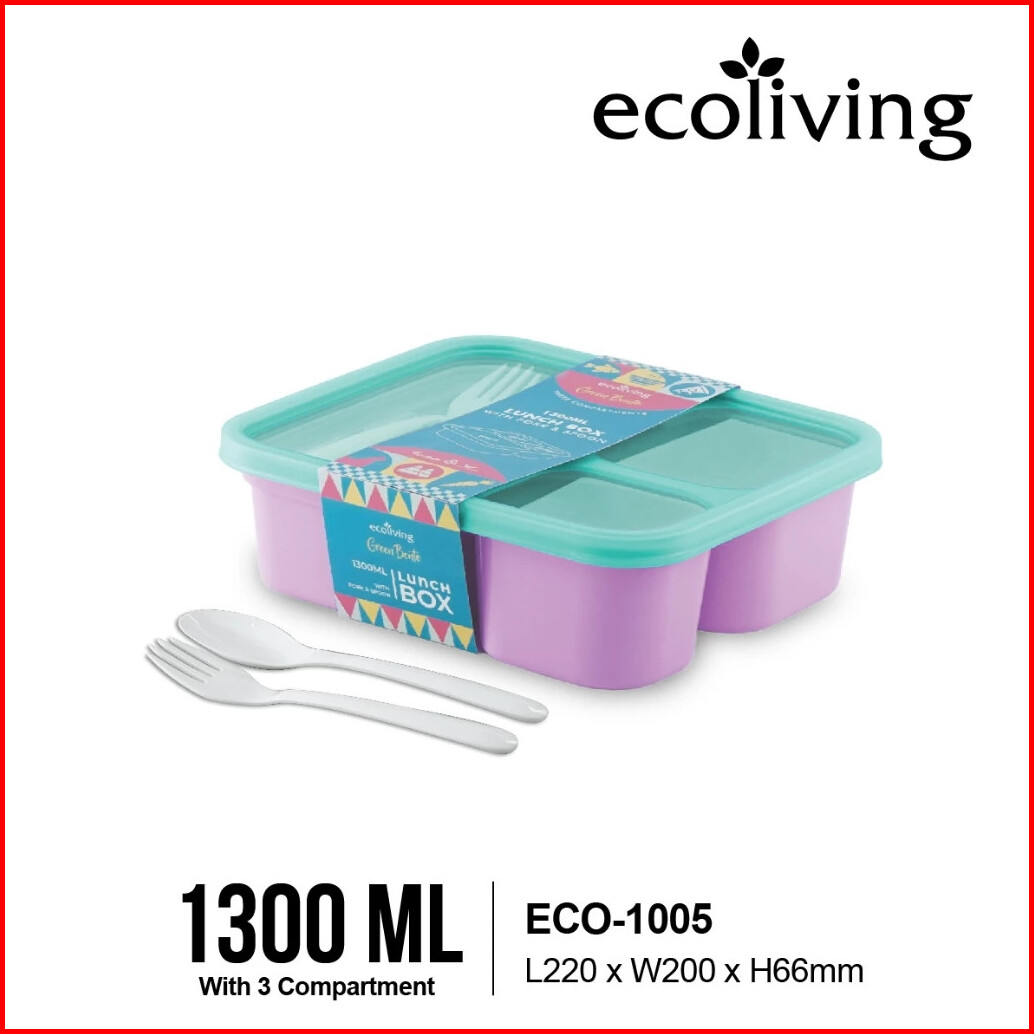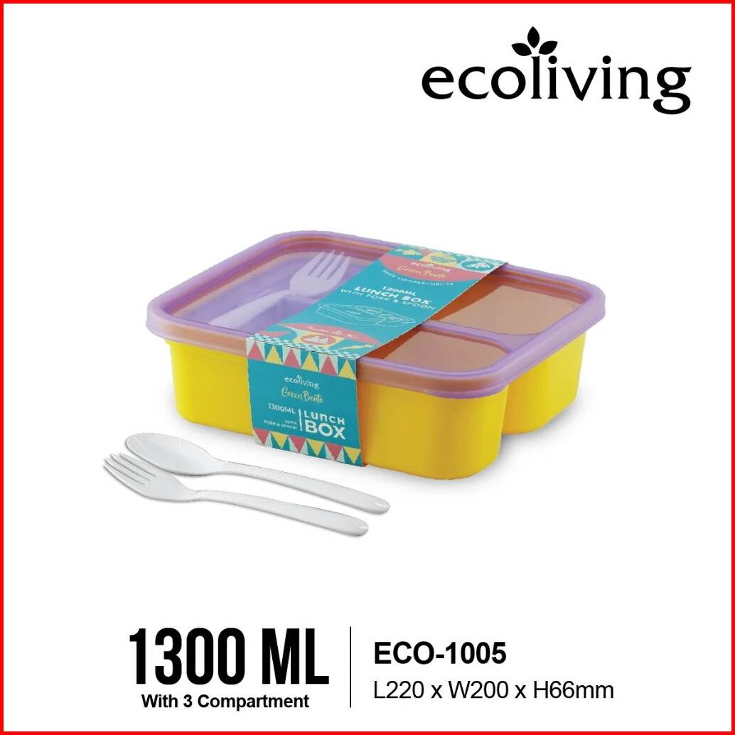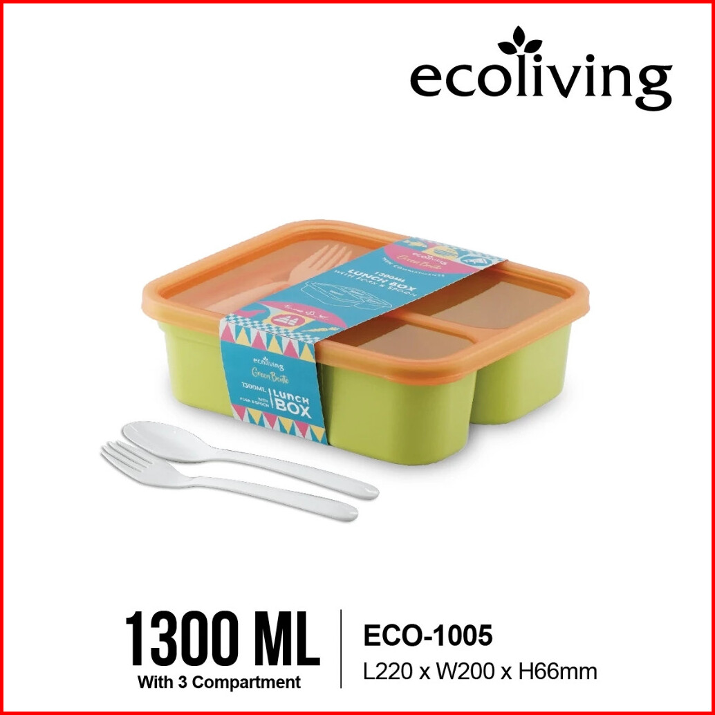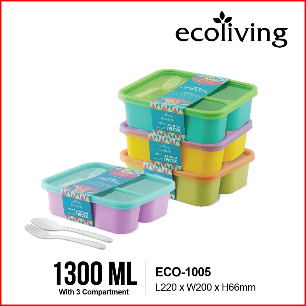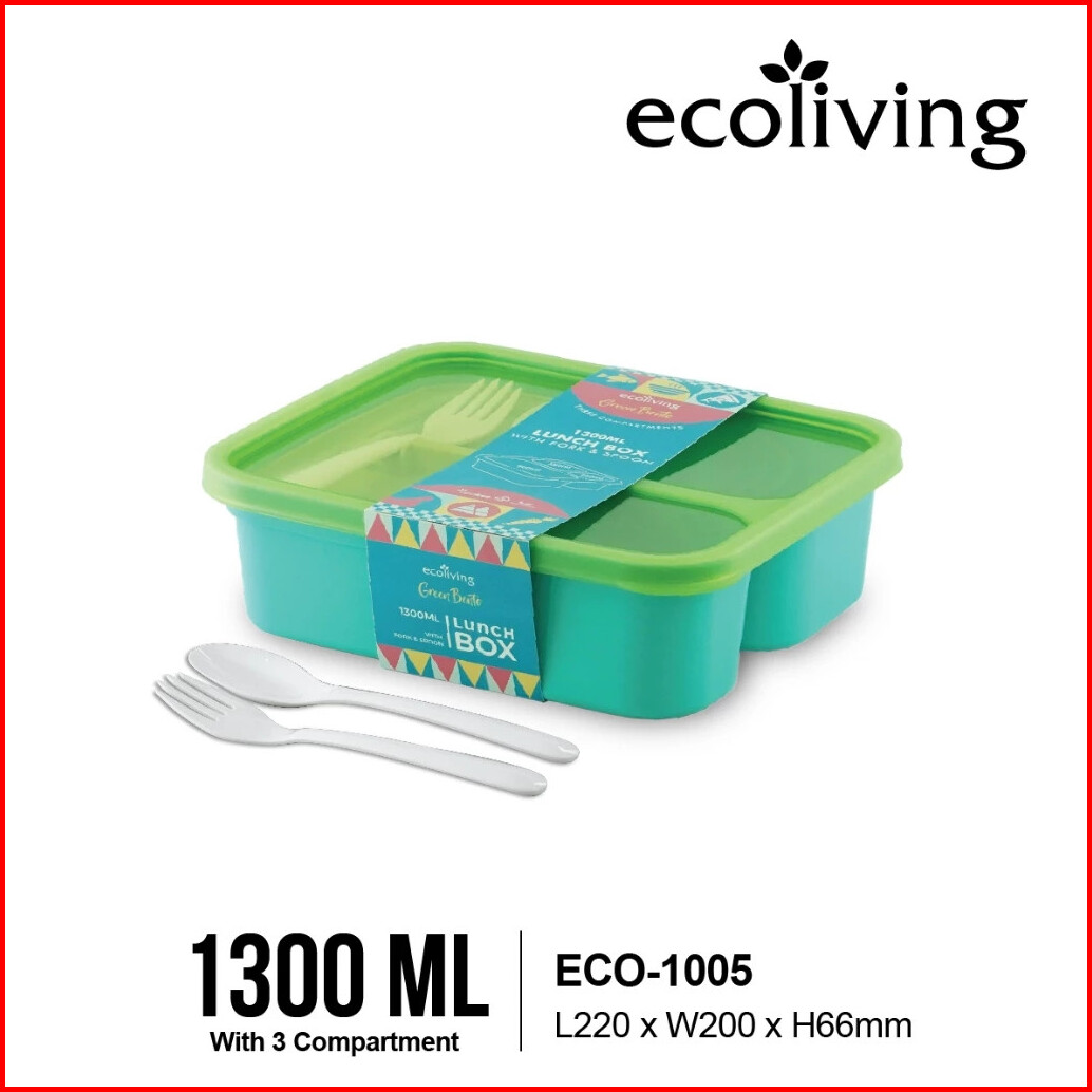 Eplas X Eco Living Green Bento 1300ml 3 Compartment Colorful Bento Lunch Box With Fork Spoon Food Container Kotak Makan