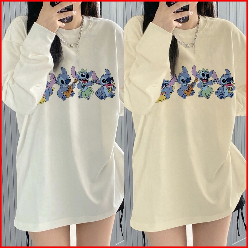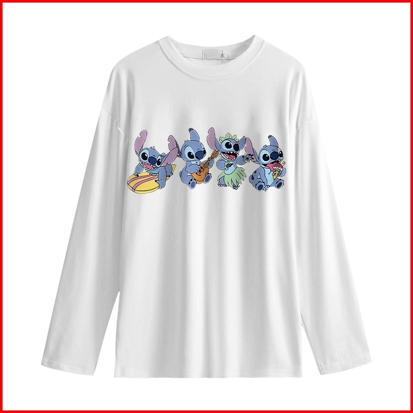 Kaos Oversize Lengan Panjang Wanita Cetakan Cute Cartoon Character Stitch Playing Musical Instruments Baju Kaos Lengan P