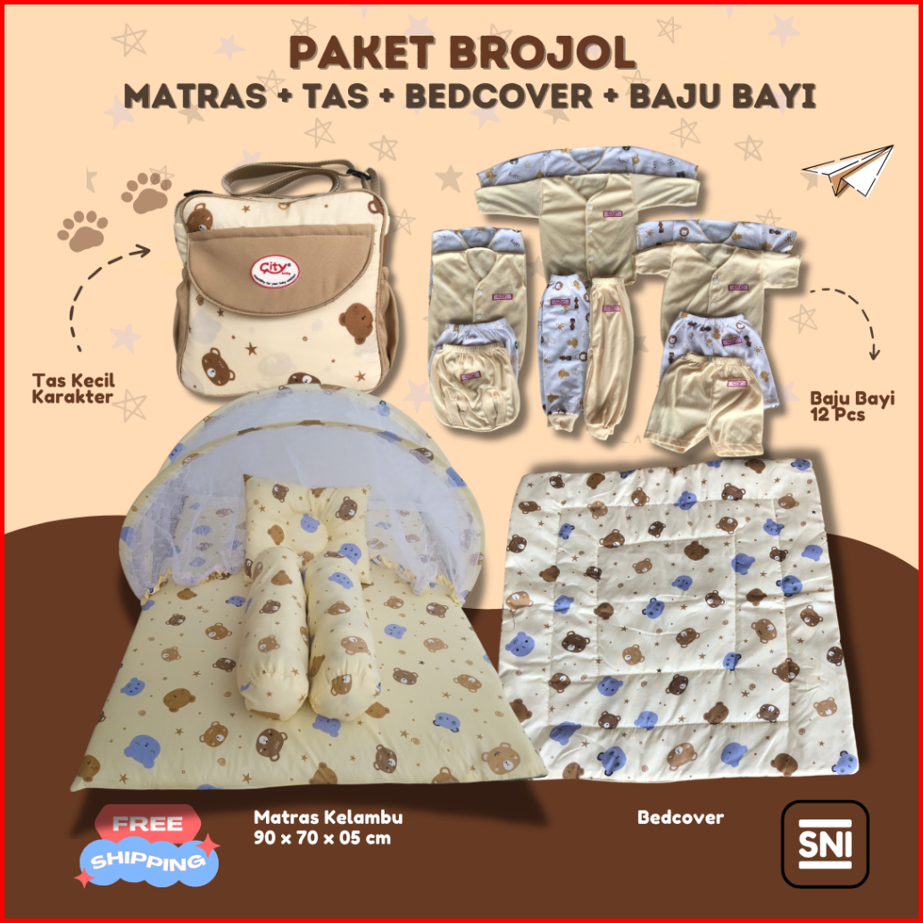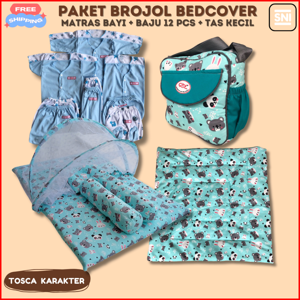 Paket Brojol Bedcover - Matras Kelambu Baju Bayi 12 Pcs Tas Selempang Karakter Bantal Guling