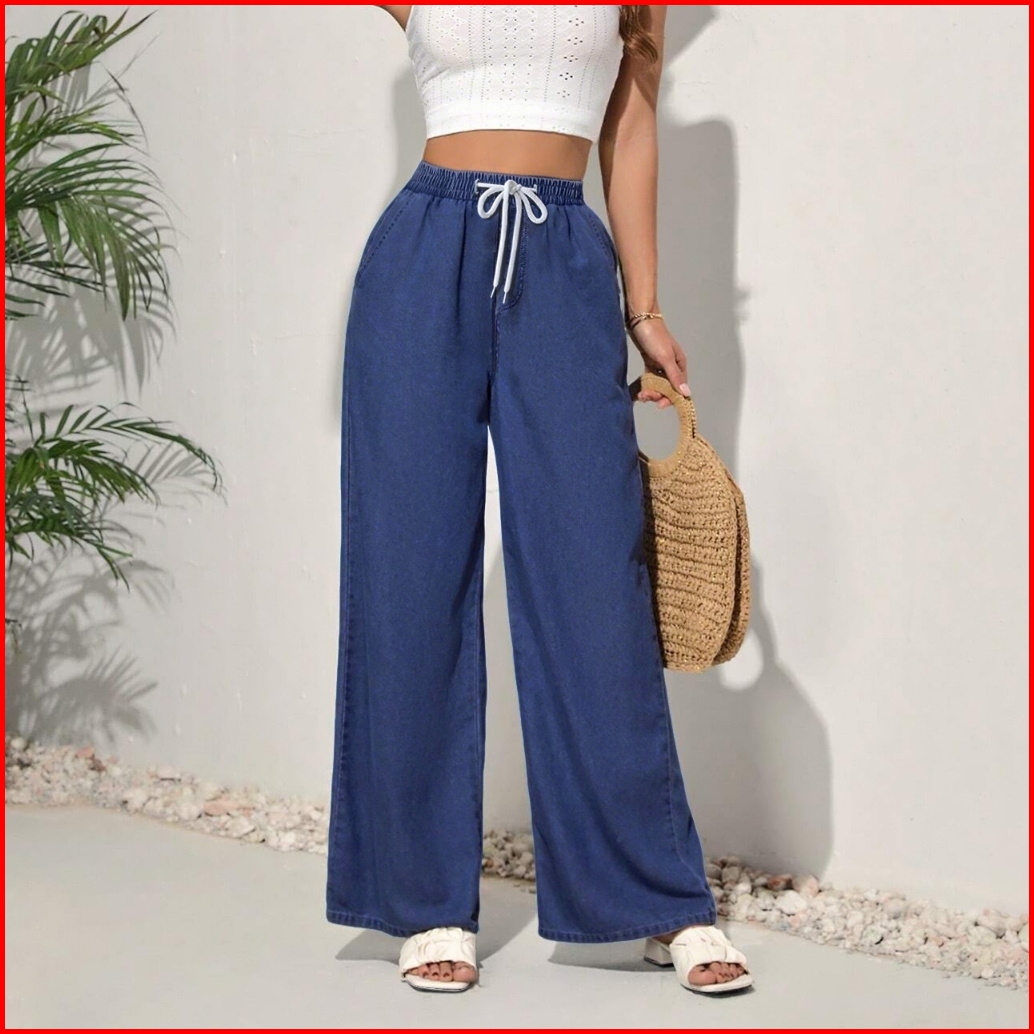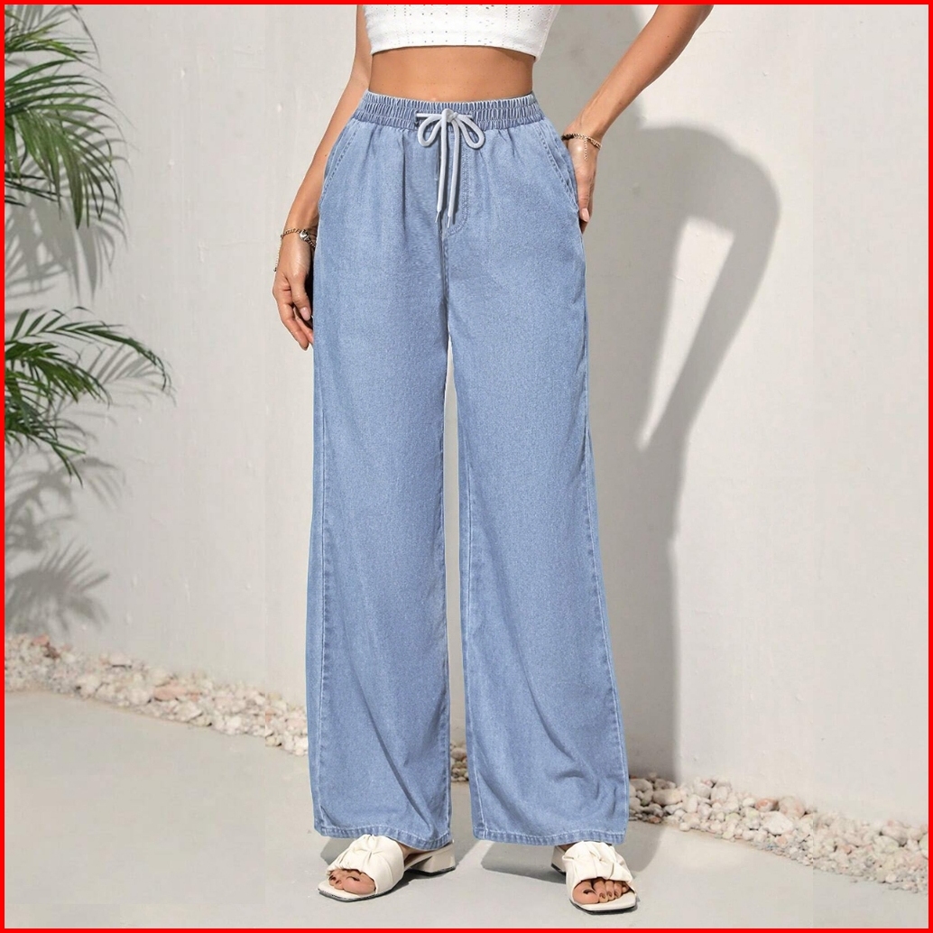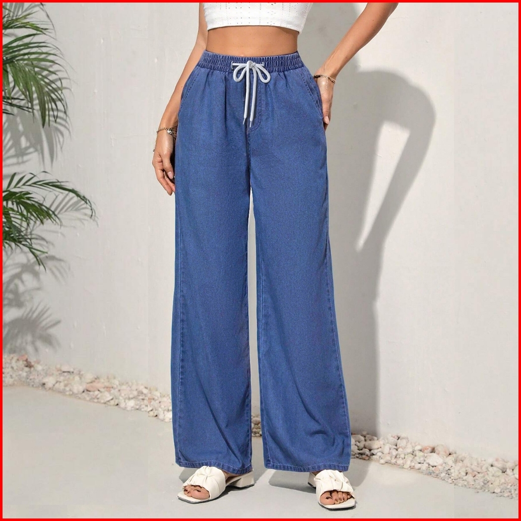Straight Cut Jeans Terbaru 2025 Elastic Waist Plus Size Denim Loose Pants Wanita