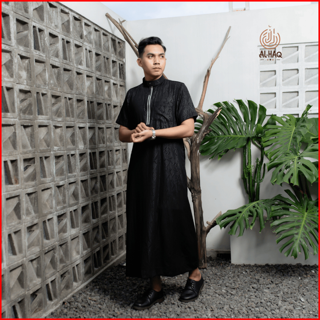 Al-haq Jubah Lengan Pendek Athar Embos Zipper Hitam Jubah Pria Gamis Pria Jubah Pria Premium Muslimm