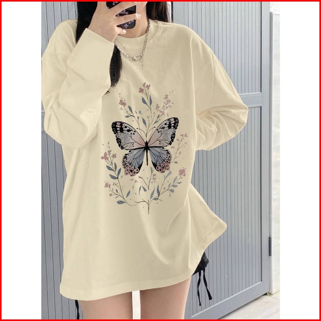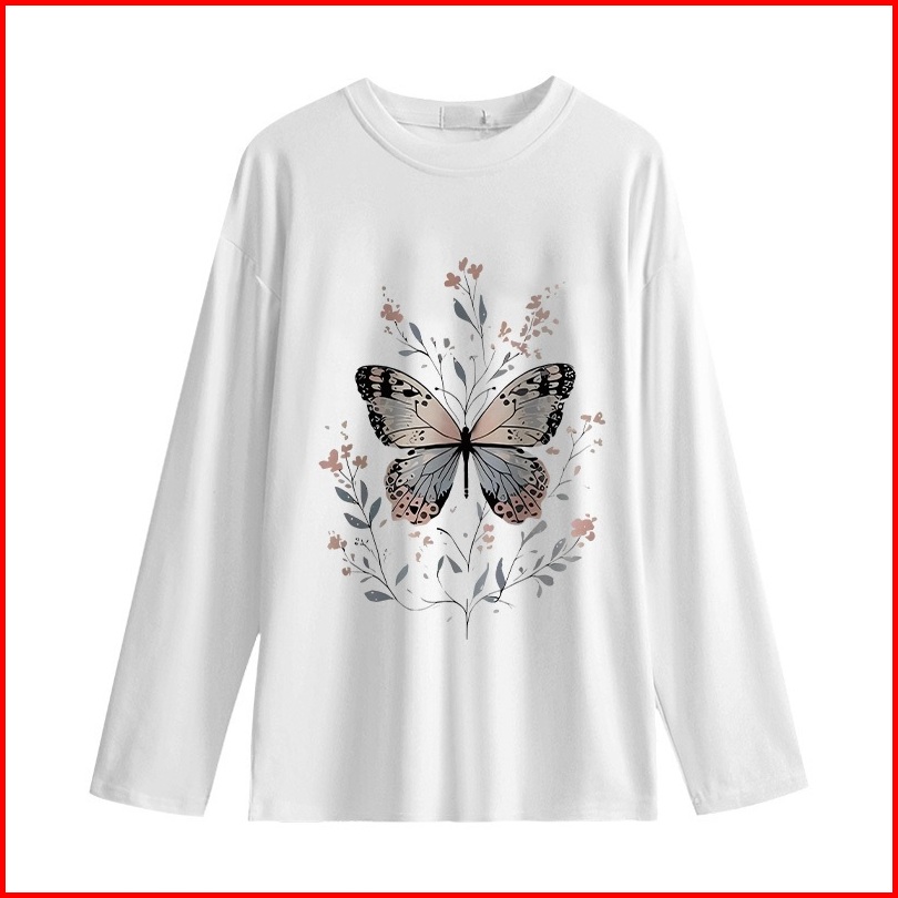 Kaos Oversize Lengan Panjang Wanita Cetakan Kupu-kupu Dan Bunga Antik Baju Kaos Lengan Panjang Wanita Terbaru Kekinian B