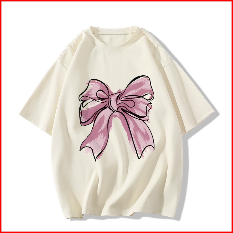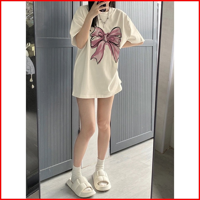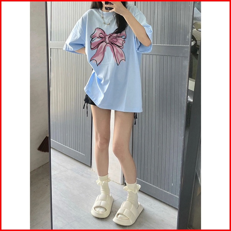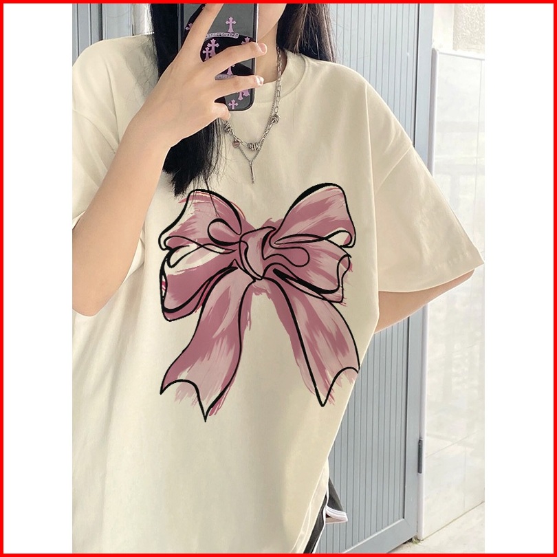 Kaos Lengan Pendek Oversize Wanita Busur Merah Muda Ekstra Besar Baju Atasan Wanita Terbaru Krim Dan Biru Muda Korean St