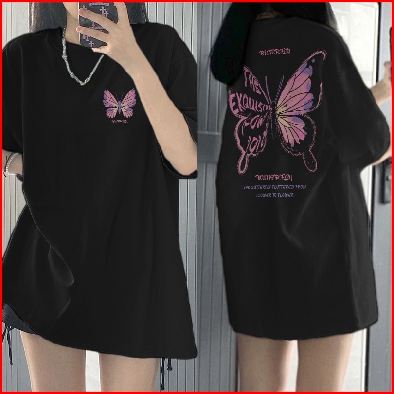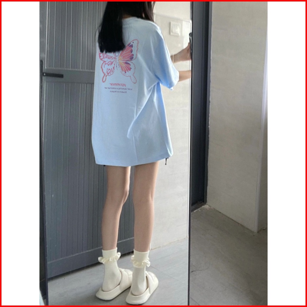 Kaos Lengan Pendek Oversize Wanita Cetakan Pink Doodle Butterfly Baju Atasan Wanita Terbaru Krim Style Kaos Polos Putih