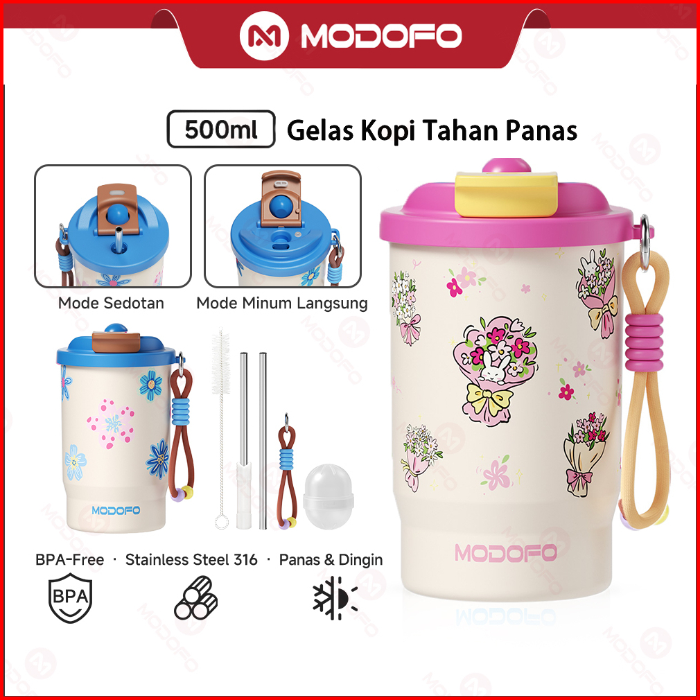 Modofo Tumbler Aesthetic Bloom Joy Termos Kopi 500ml Botol Minum Gelas Kopi Stainless 316 Tumbler Tahan Panas Dingin 24
