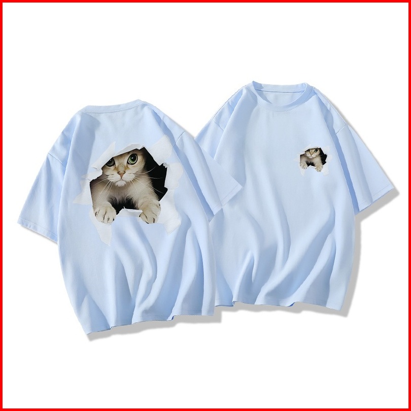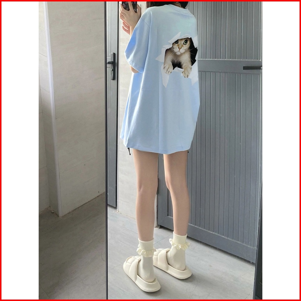 Kaos Lengan Pendek Oversize Wanita Cetakan Cute Cat With Holes Baju Atasan Wanita Terbaru Krim Style Kaos Polos Putih Pr