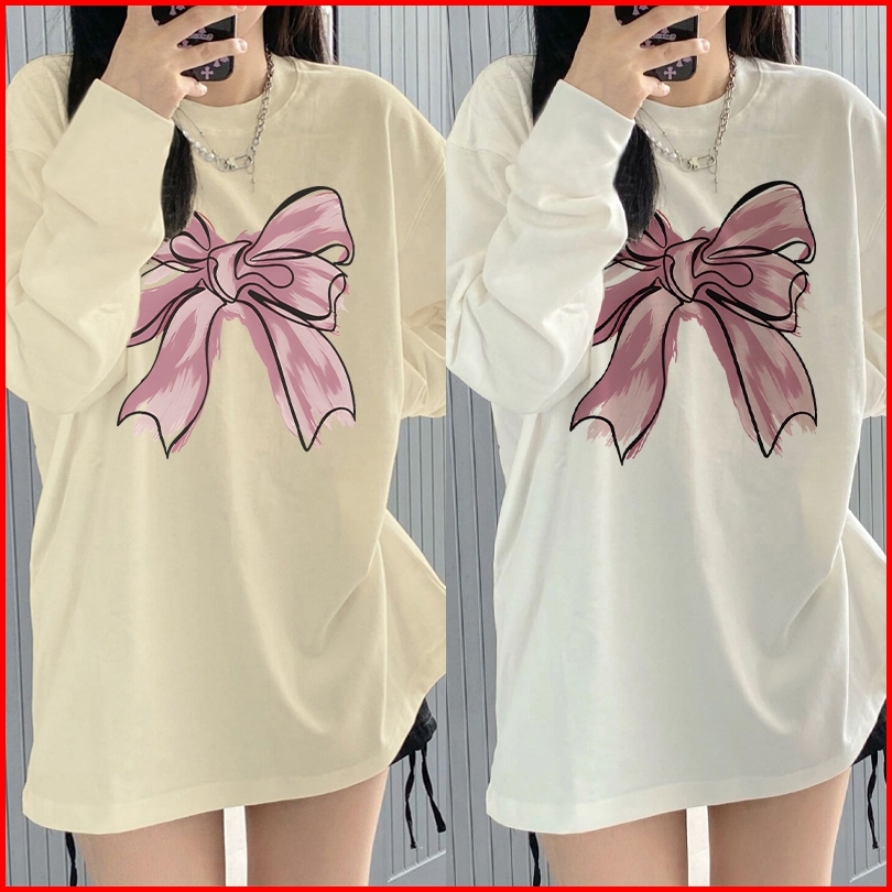 Kaos Oversize Lengan Panjang Wanita Cetakan Cetakan Pita Merah Muda Yang Indah Baju Kaos Wanita Cream Korea Lengan Panja