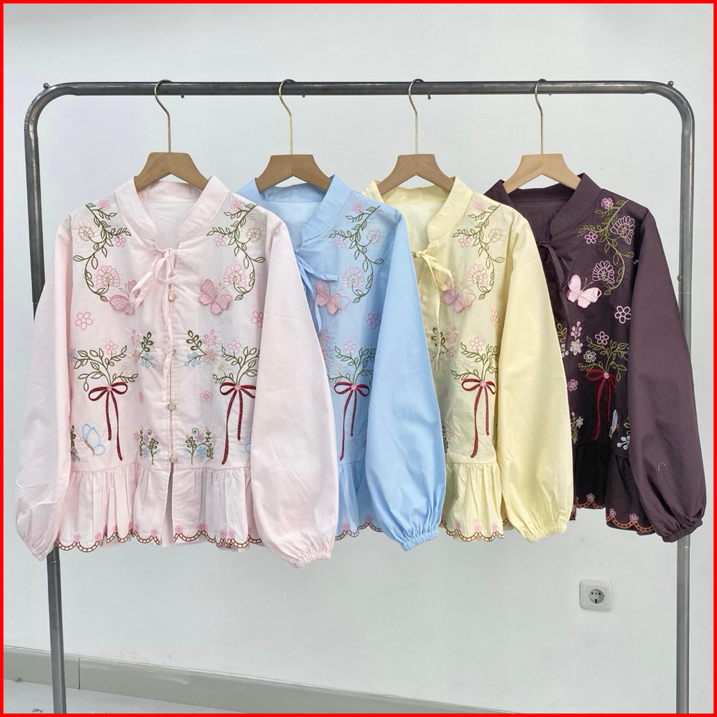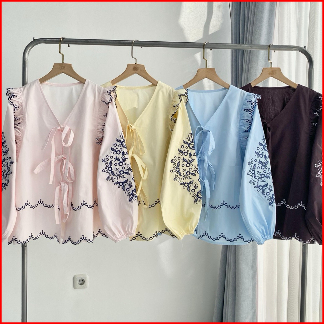 Atasan Katun Bordir Cantik Lengan Panjang Blouse Pita Ruffle Modis