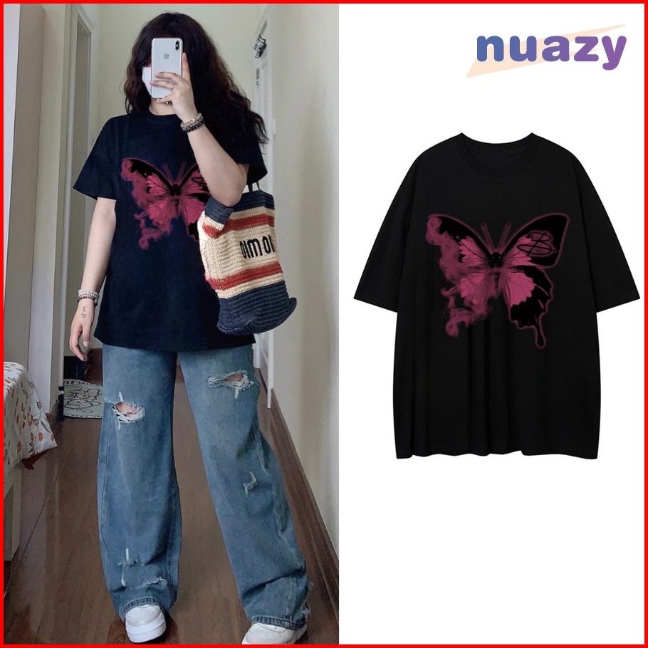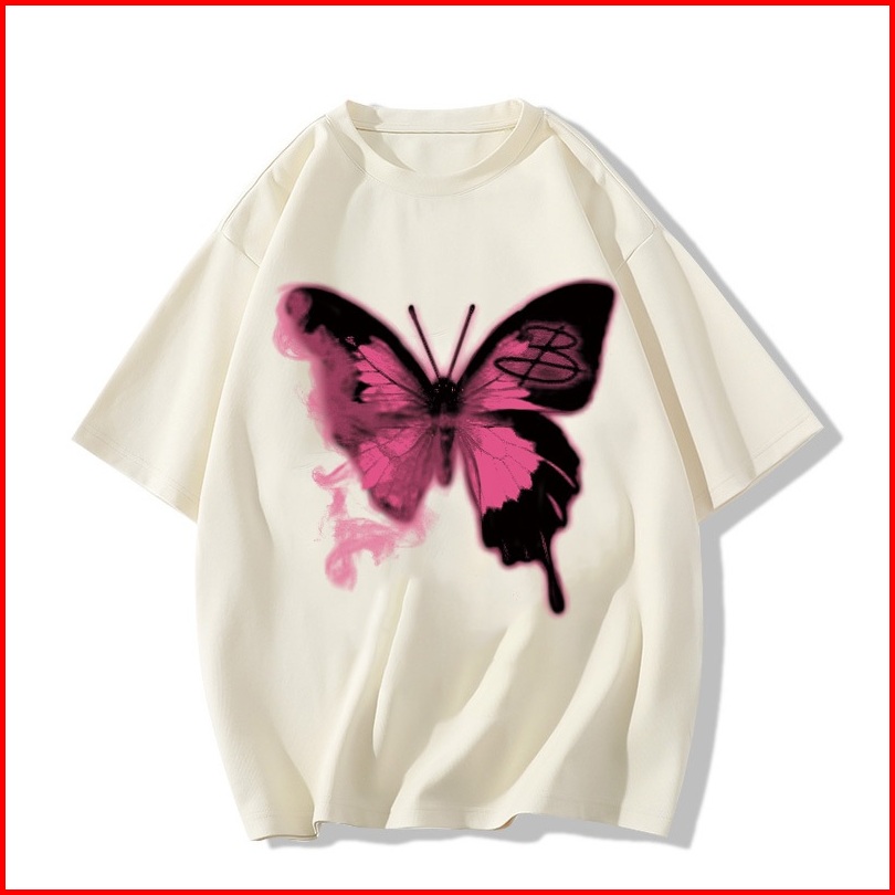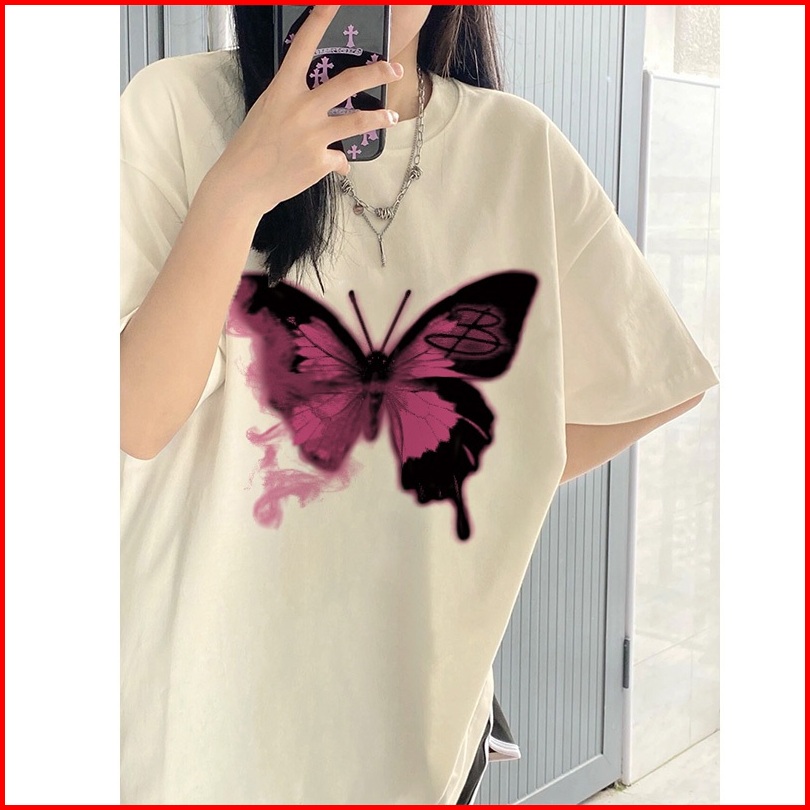 Kaos Lengan Pendek Oversize Wanita Cetakan Kupu-kupu Retro Baju Atasan Wanita Terbaru Krim Style Kaos Polos Putih Premiu