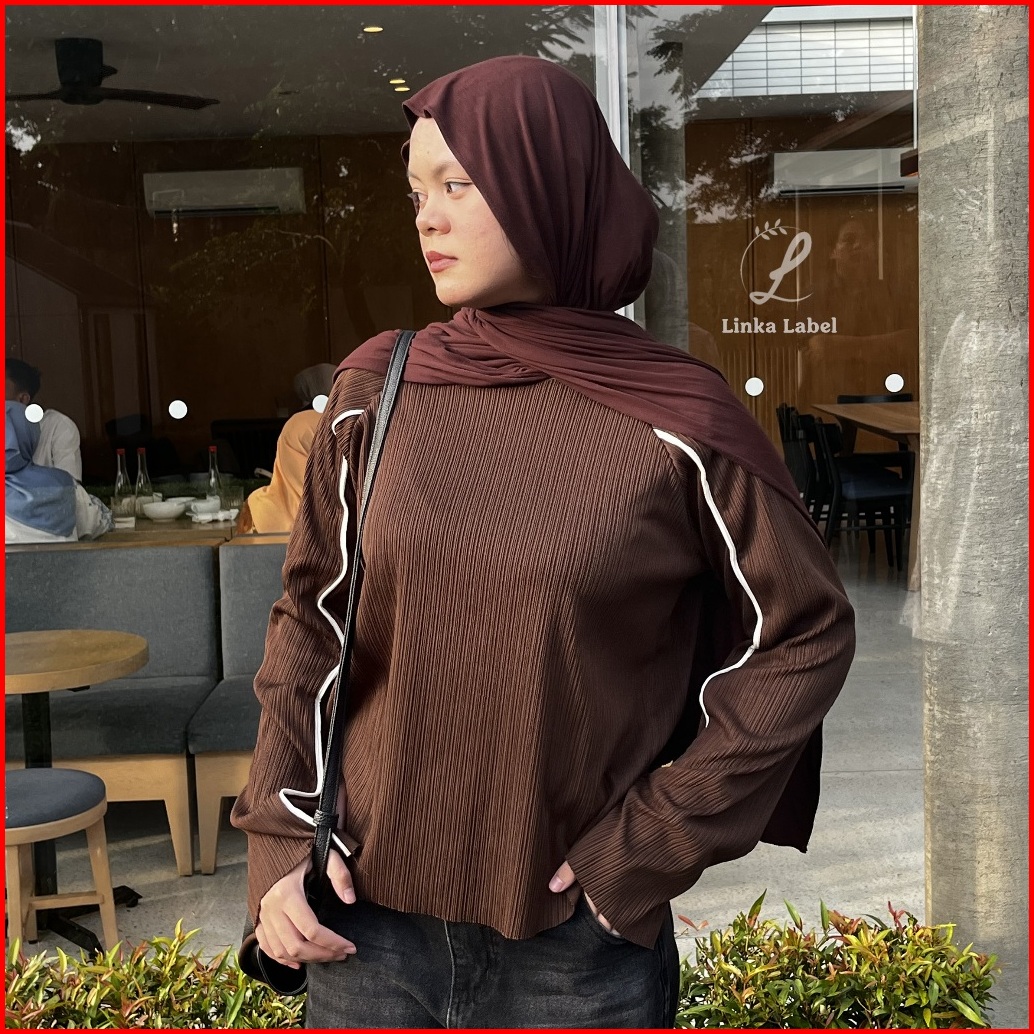 Linka - Atasan Knit Garis Piped Knit Top Overlong Sleeve Piped Plisket Top Knit Boxy