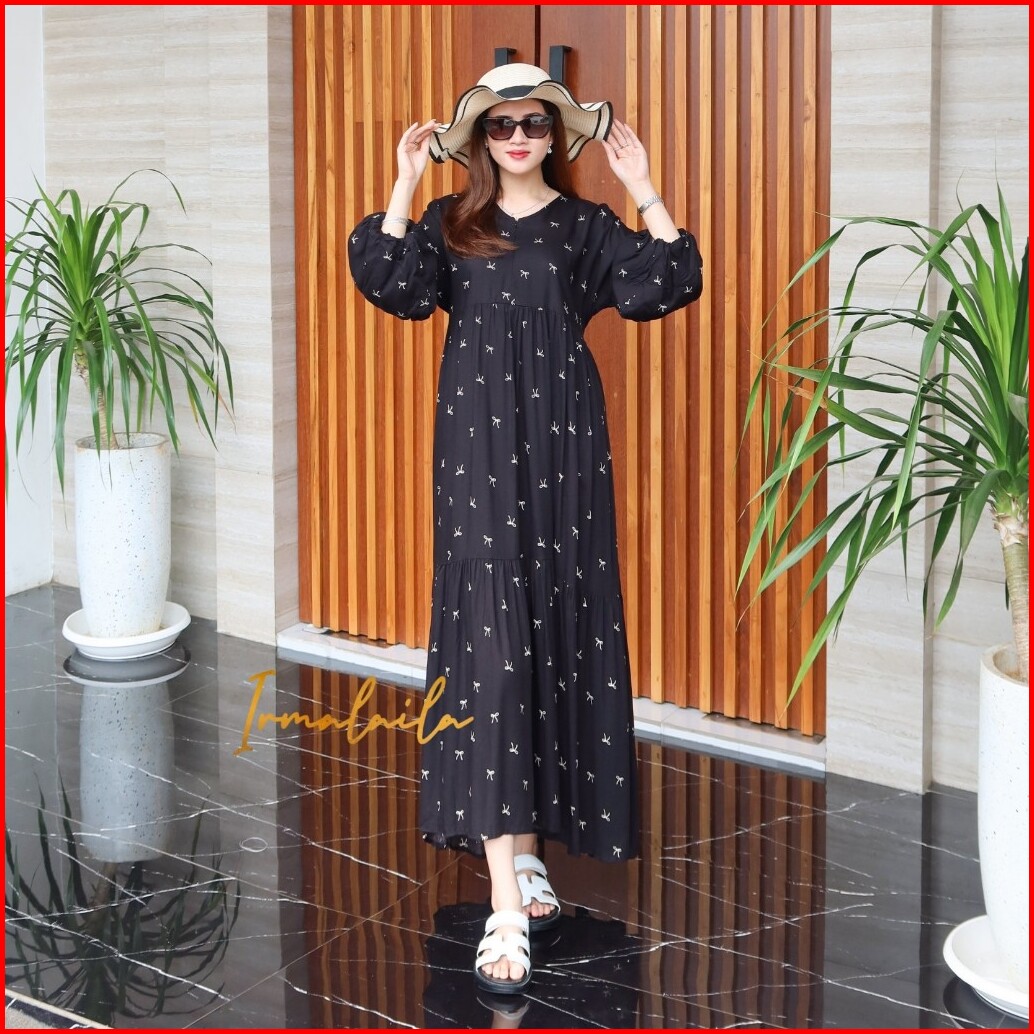 Irmalaila - Laluna Dress Midi Rayon Motif Model Ruffle Lebar Mayung Cantik Elegan Nyaman Dress Daily