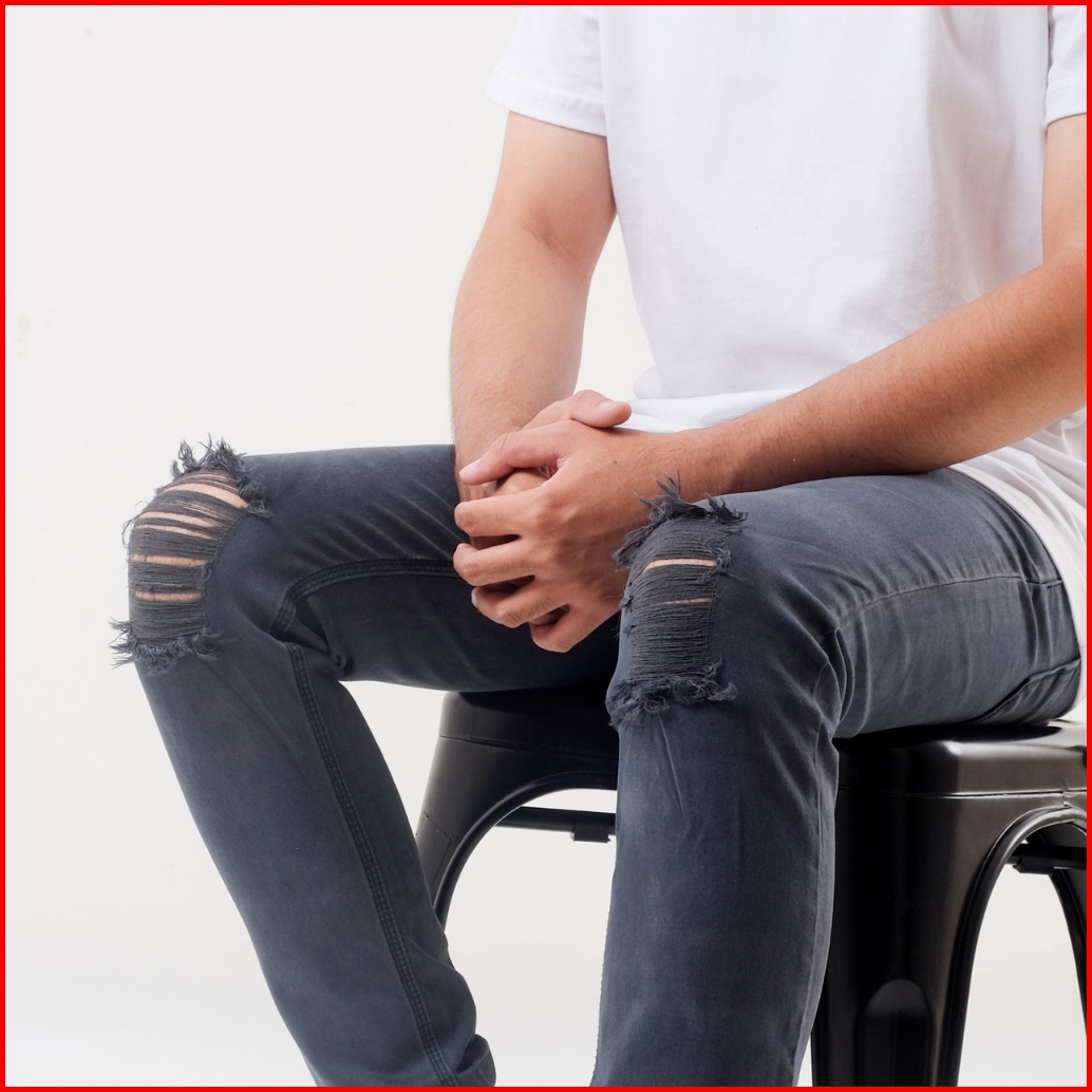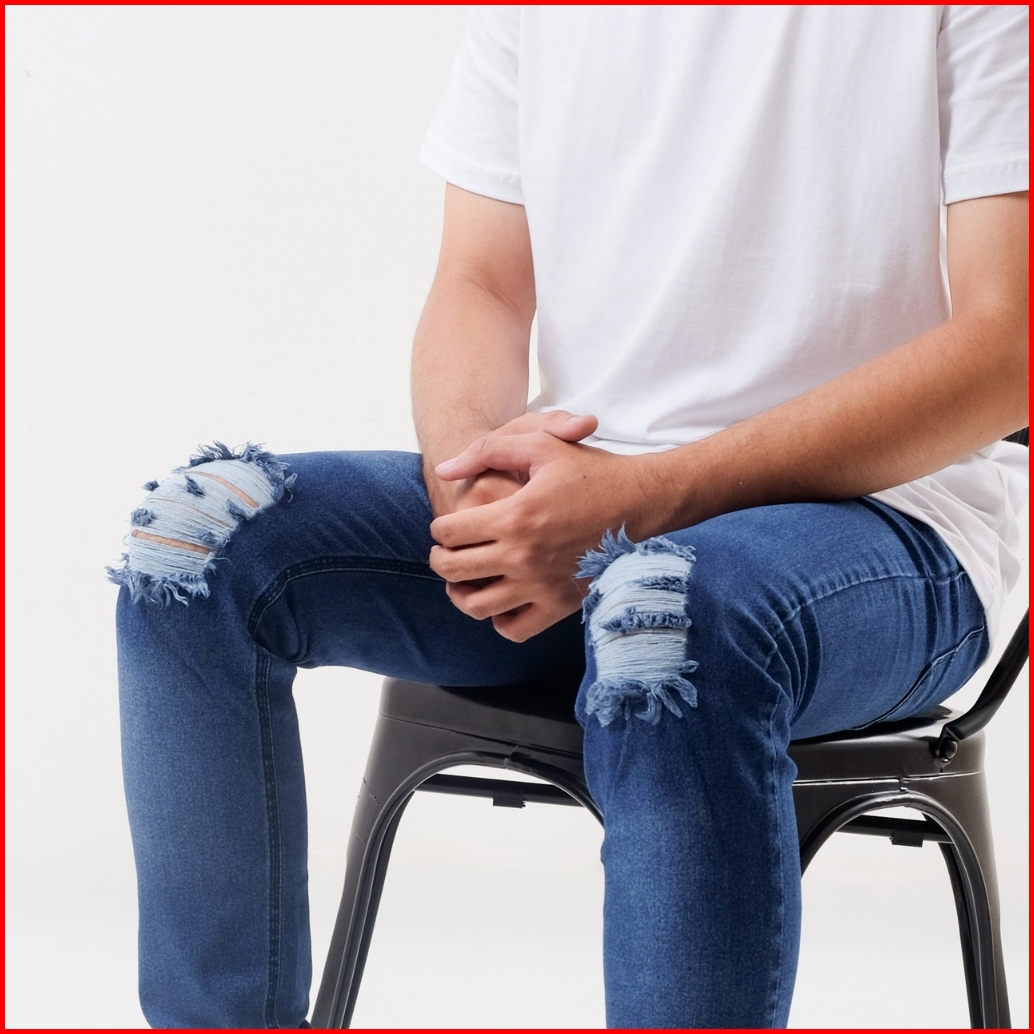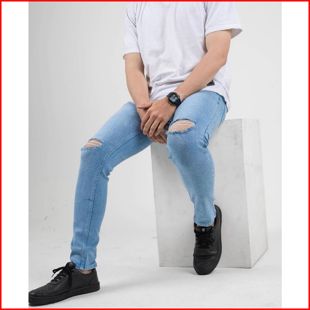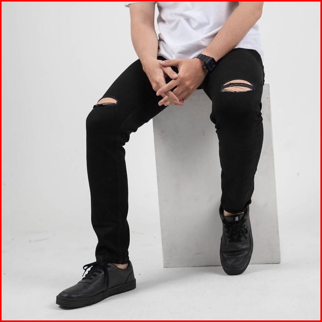 Cloverfield - Celana Jeans Pria Sobek Lutut Robek Ripped Slimfit Bikers Hitam