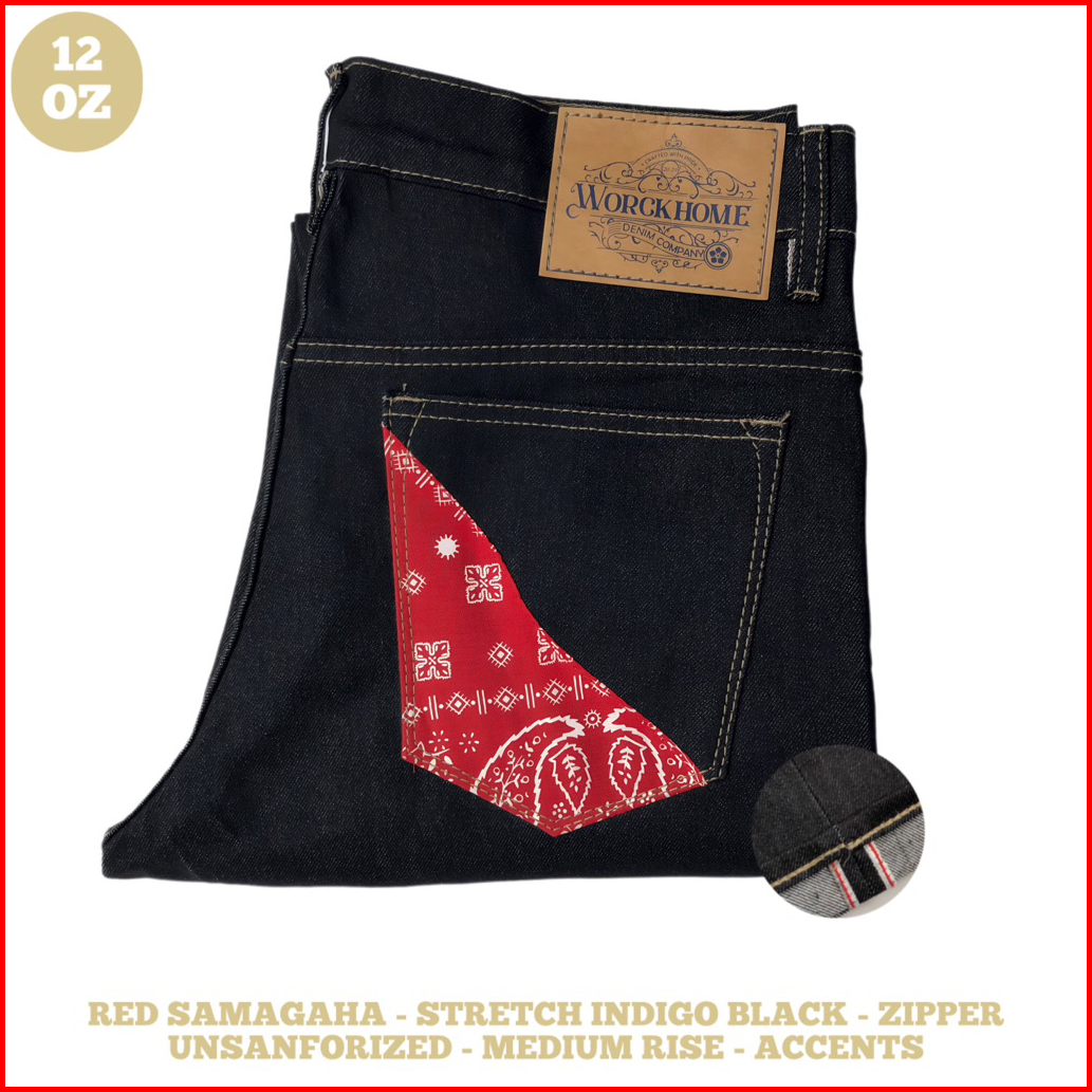 Worckhome Denim - Celana Jeans Pria Red Samagaha Stretch Indigo Black 13oz Accents
