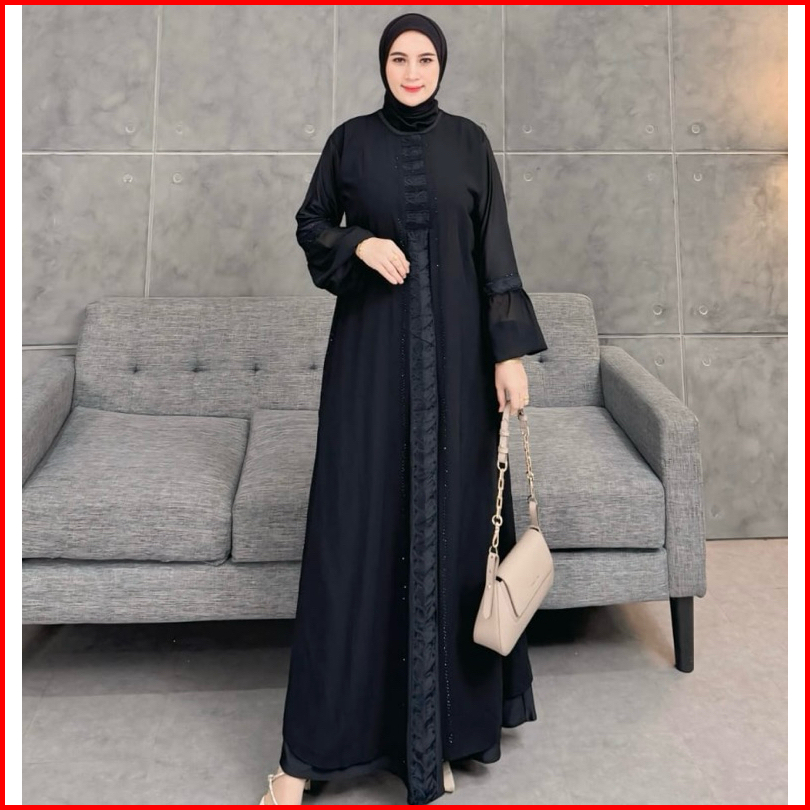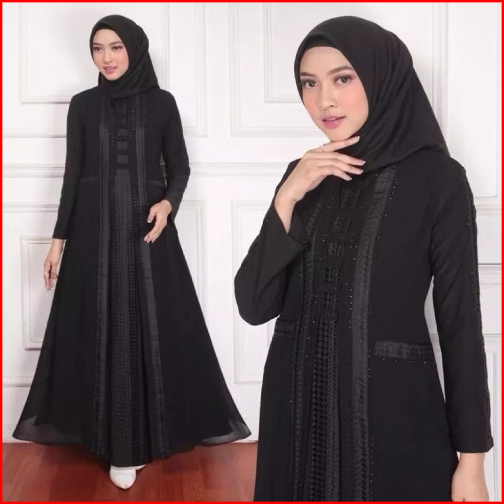 Gamis Abaya Turkey Bordir Full Hitam Saku Tangga