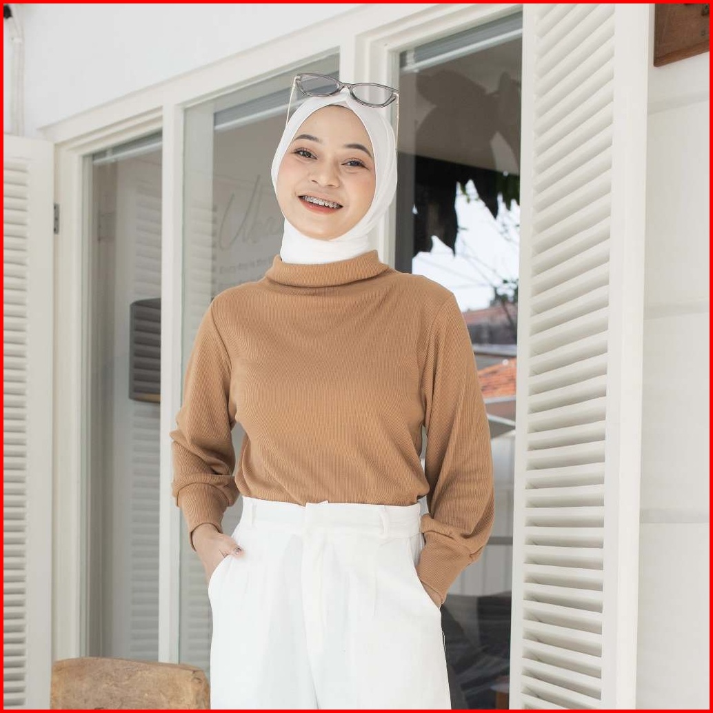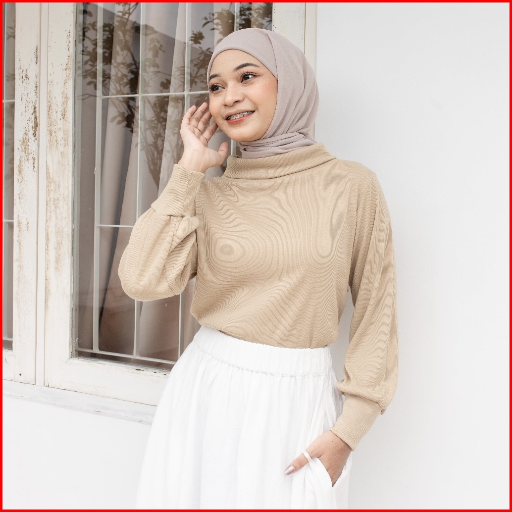 Yeppuoutfit - Sara Top Manset Lengan Panjang Polos Detail Lengan Balon Rib Blouse Turtleneck