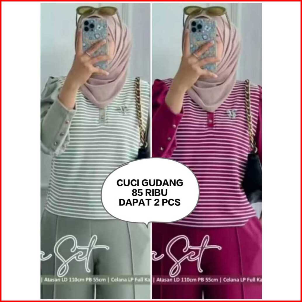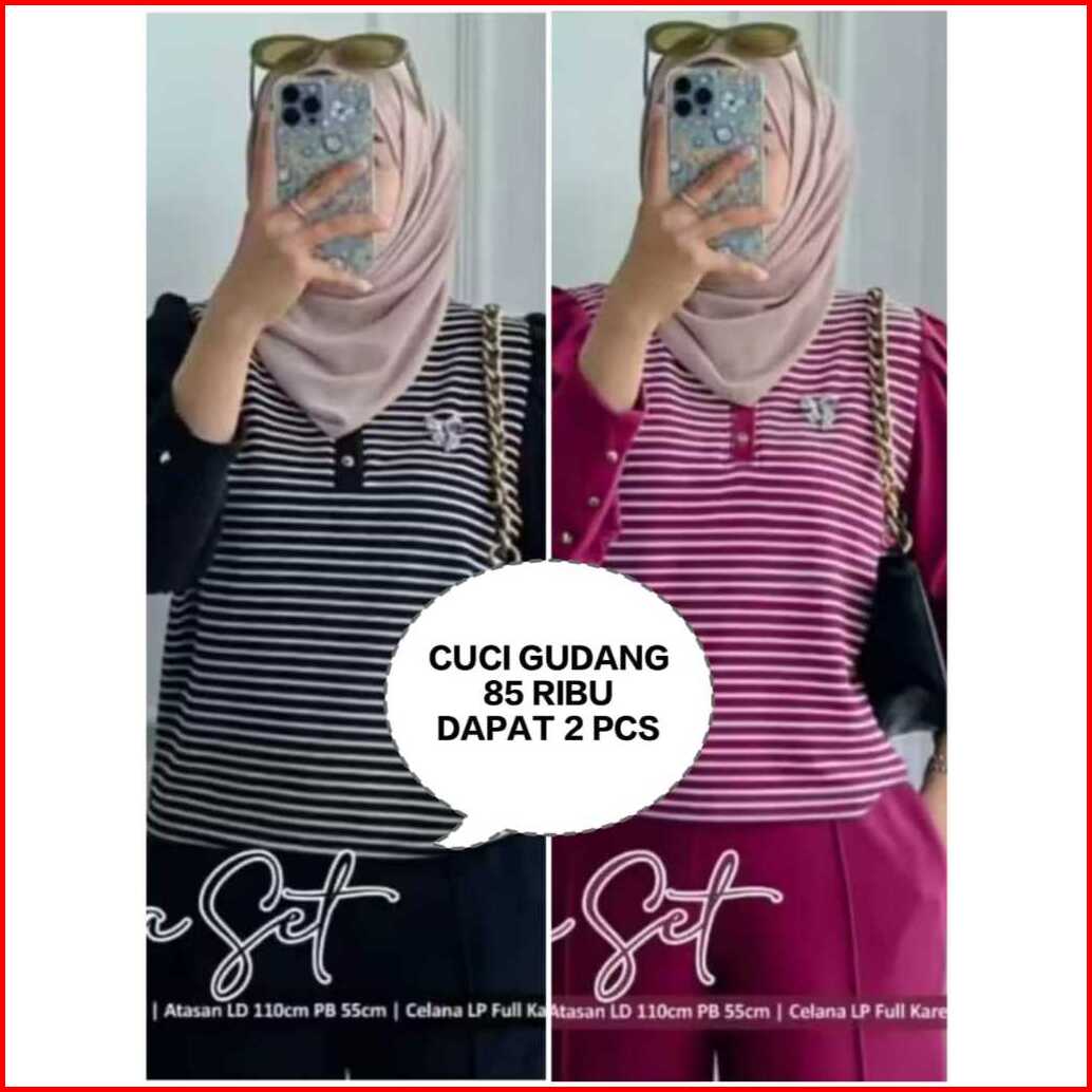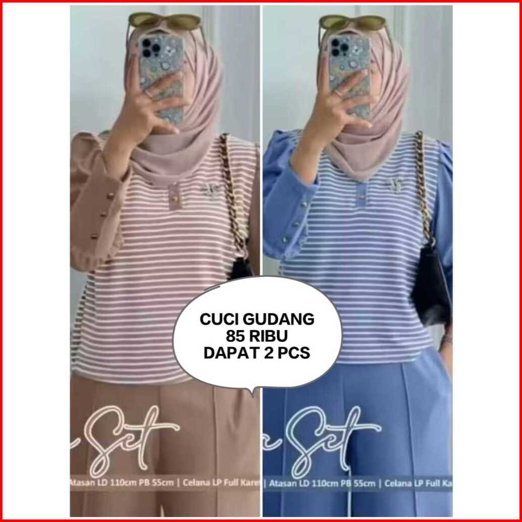 Cuci Gudang 85 Ribu Dapat 2 Pcs Olila Set Jumbo Baju Setelan Wanita Terbaru Motif Salur Kulot Knit Import Lengan Puffy B