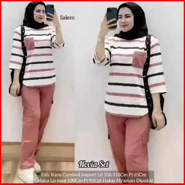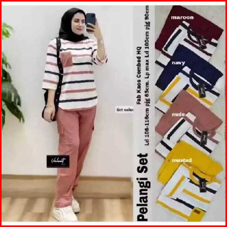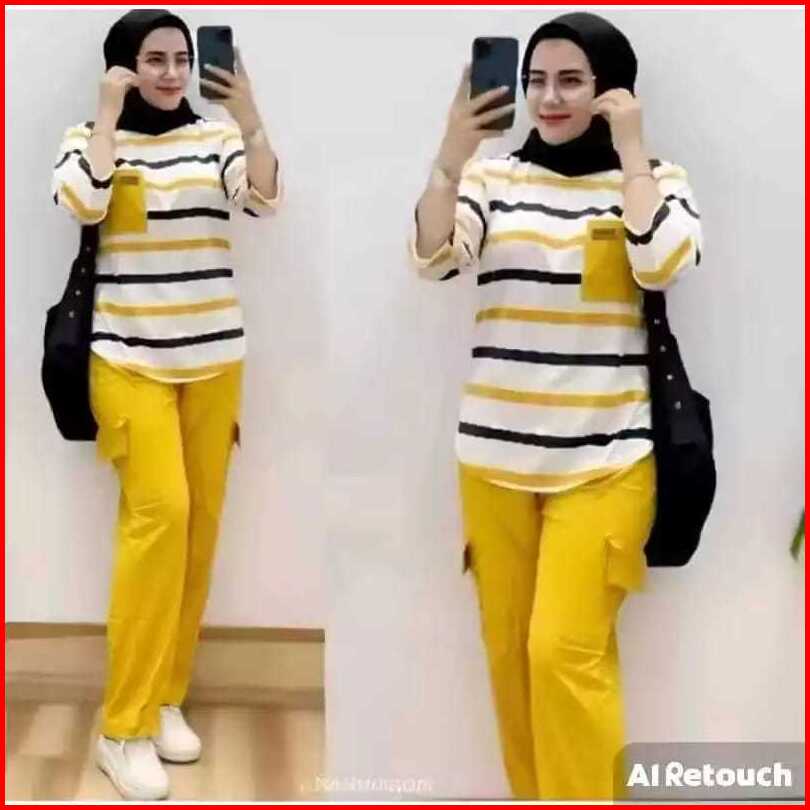 Setelan Wanita Terbaru 2025 Motif Salur Pelangi Matt Combed 24s Set Cargo Blus Garis-garis Wanita Lengan Panjang Viral B