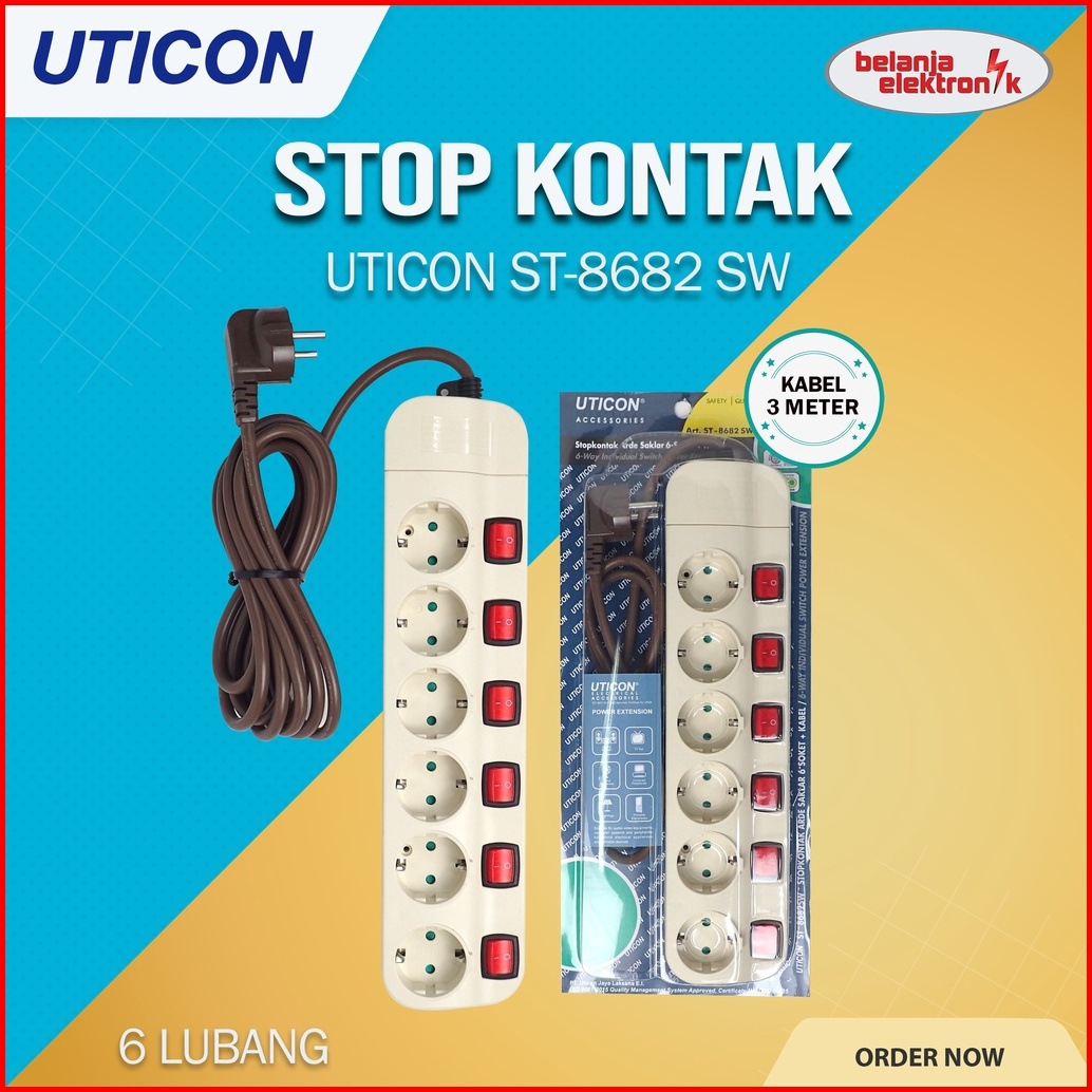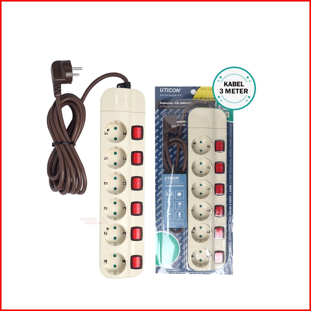 Stop Kontak 6 Lubang Kabel 3 Meter Terminal Kontak Kuningan Saklar Uticon St-8682 Sw