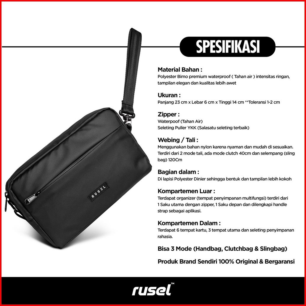 Rusel Co - Handbag Aruna Black Tas Selempang Pria I Tas Clutch Pria Tas Handbag Multifungsi Anti Air Tas Tangan Tas Pria