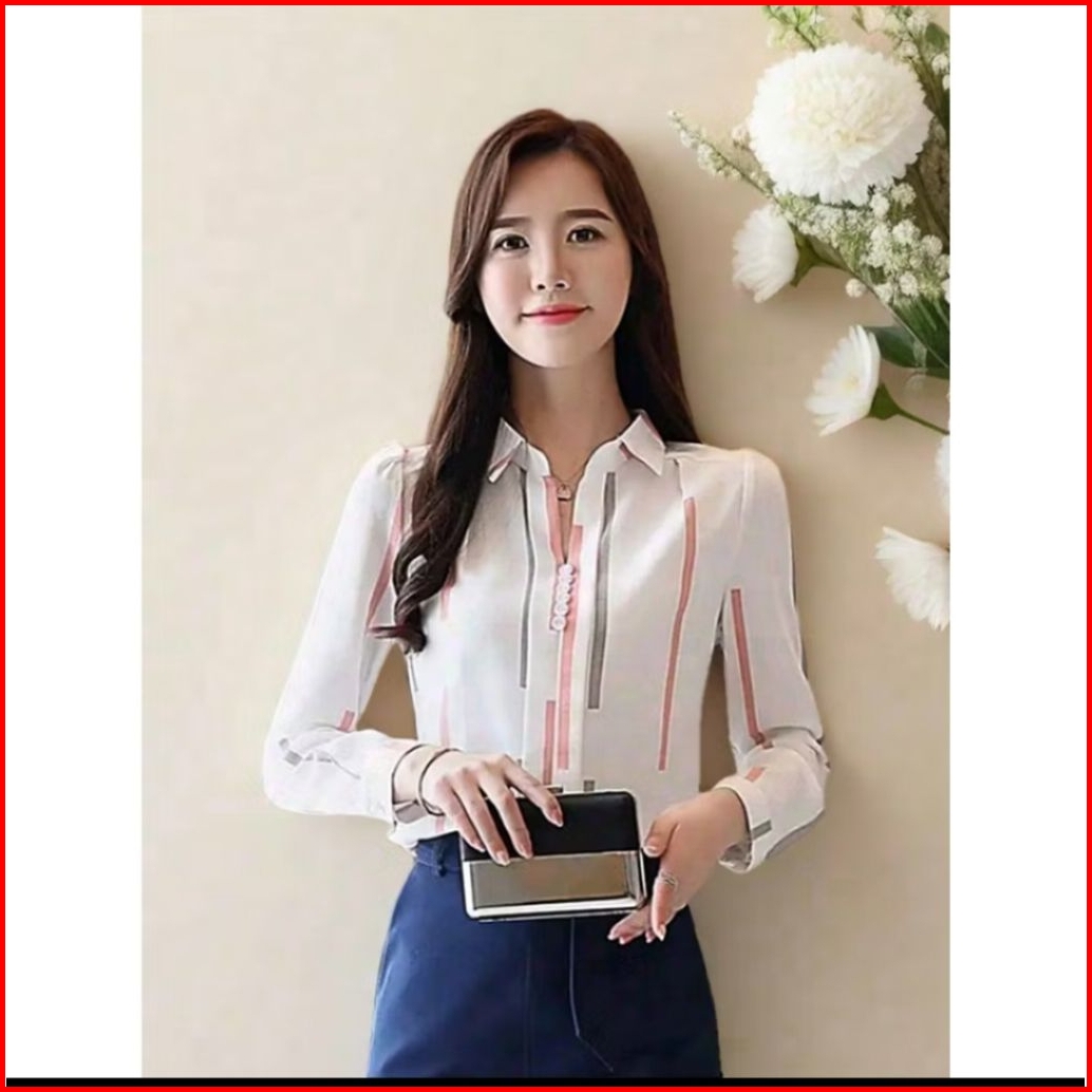 Blouse Motif Salur Atasan Kemeja Wanita Terbaru Kekinian Lengan Panjang Elegan Casual