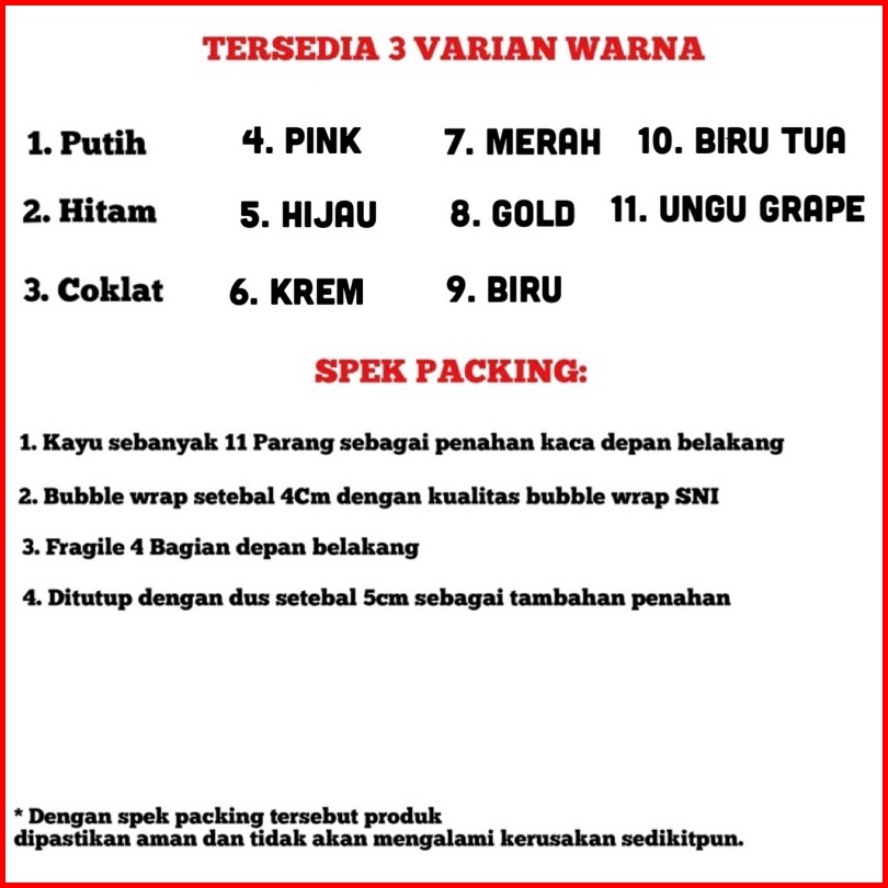 Hitam, Putih, Gold, Ungu Grape, Biru Tua, Krem Kayu, Biru, Hijau, Pink, Coklat, Merah