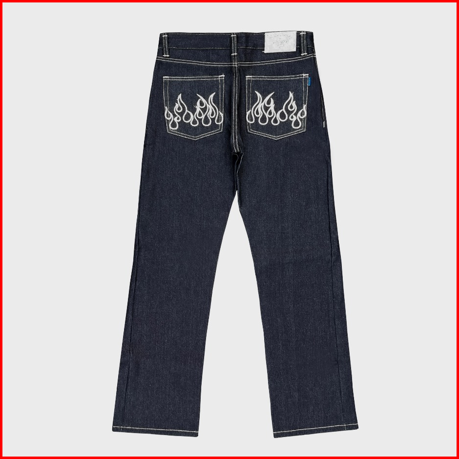 Weird Denim Celana Pria Jeans Selvedge Shellstitch 16 Oz Black Indigo Flame Art