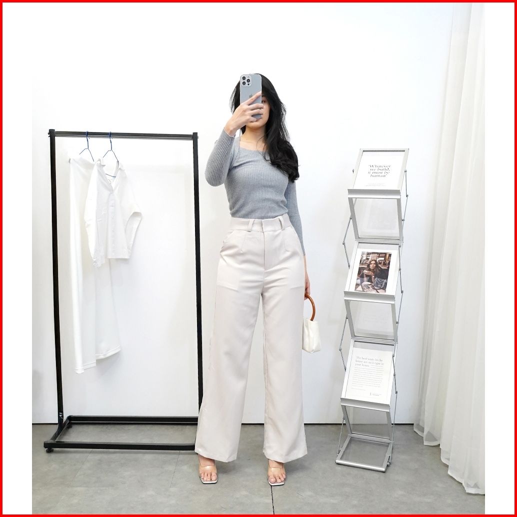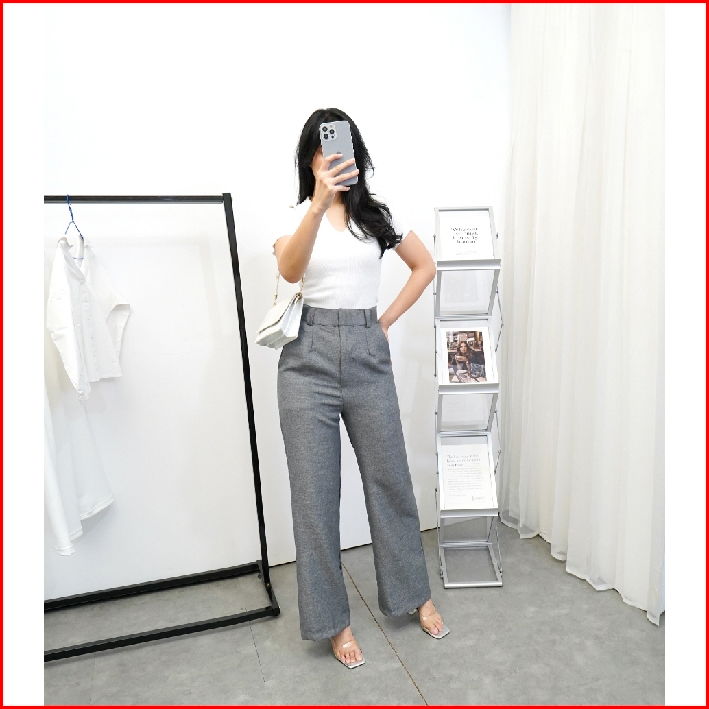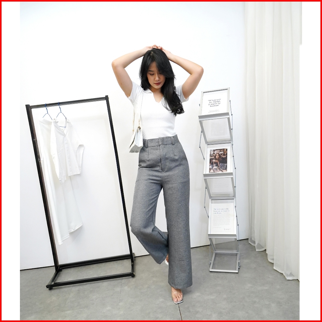 Amarave Celana Panjang Wanita Long Pants Highwaist Loose Flare Cutbray Pants Celana Bahan Kekinian