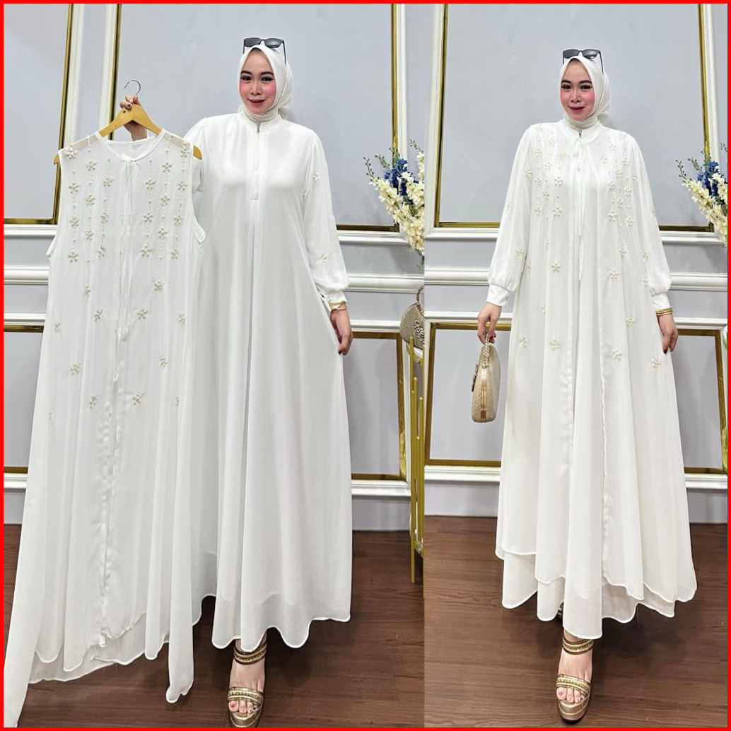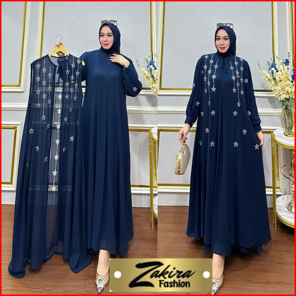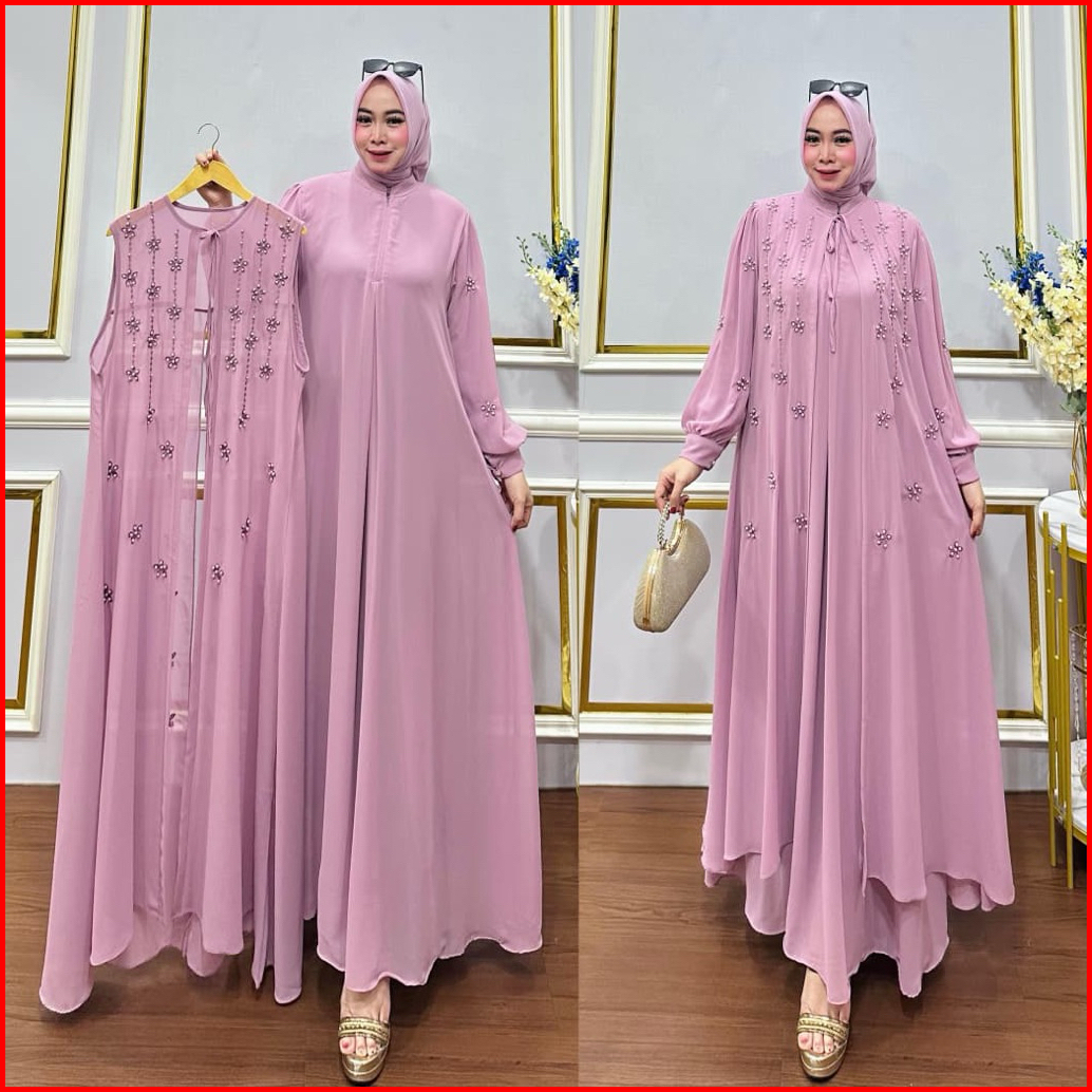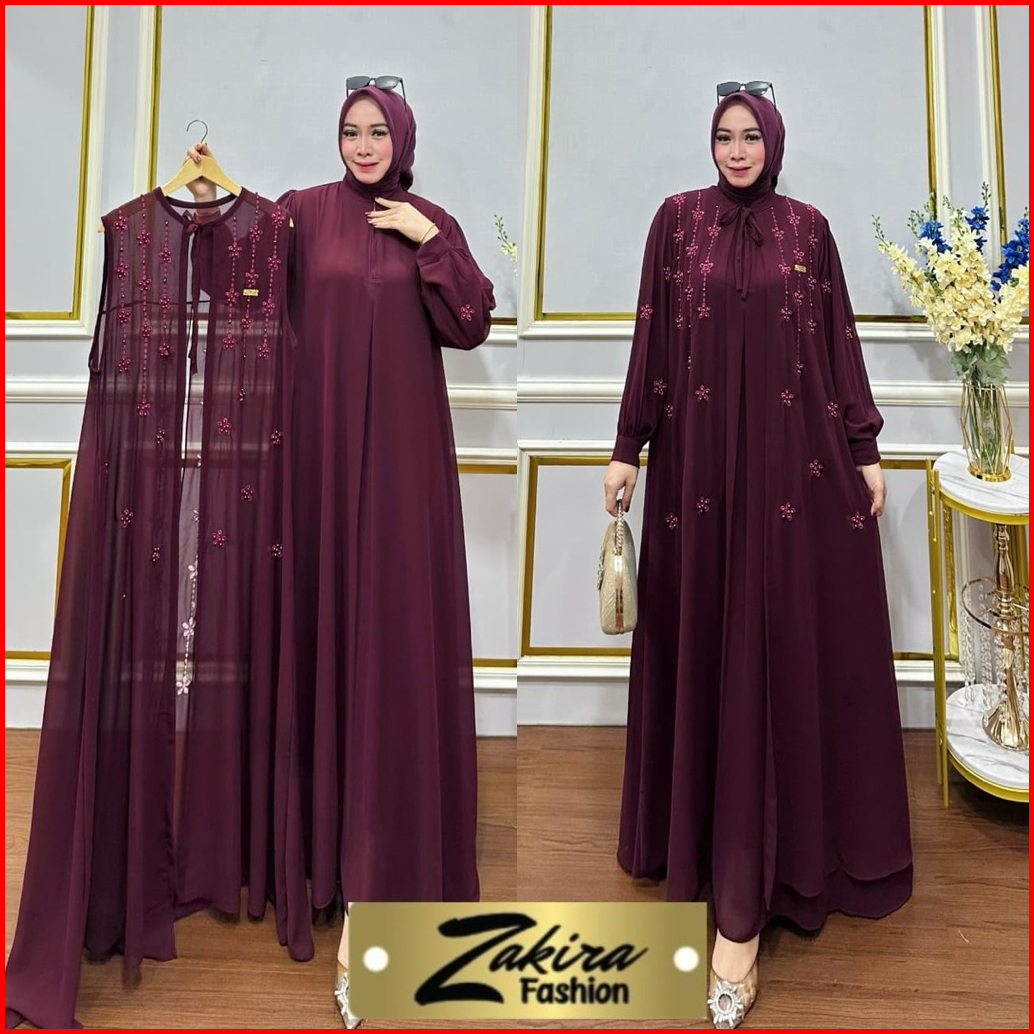 Zakira Fashion - Gamis Wanita Set Outer Bahan Ceruty Babydoll Bordir Aksen Payet Mutiara