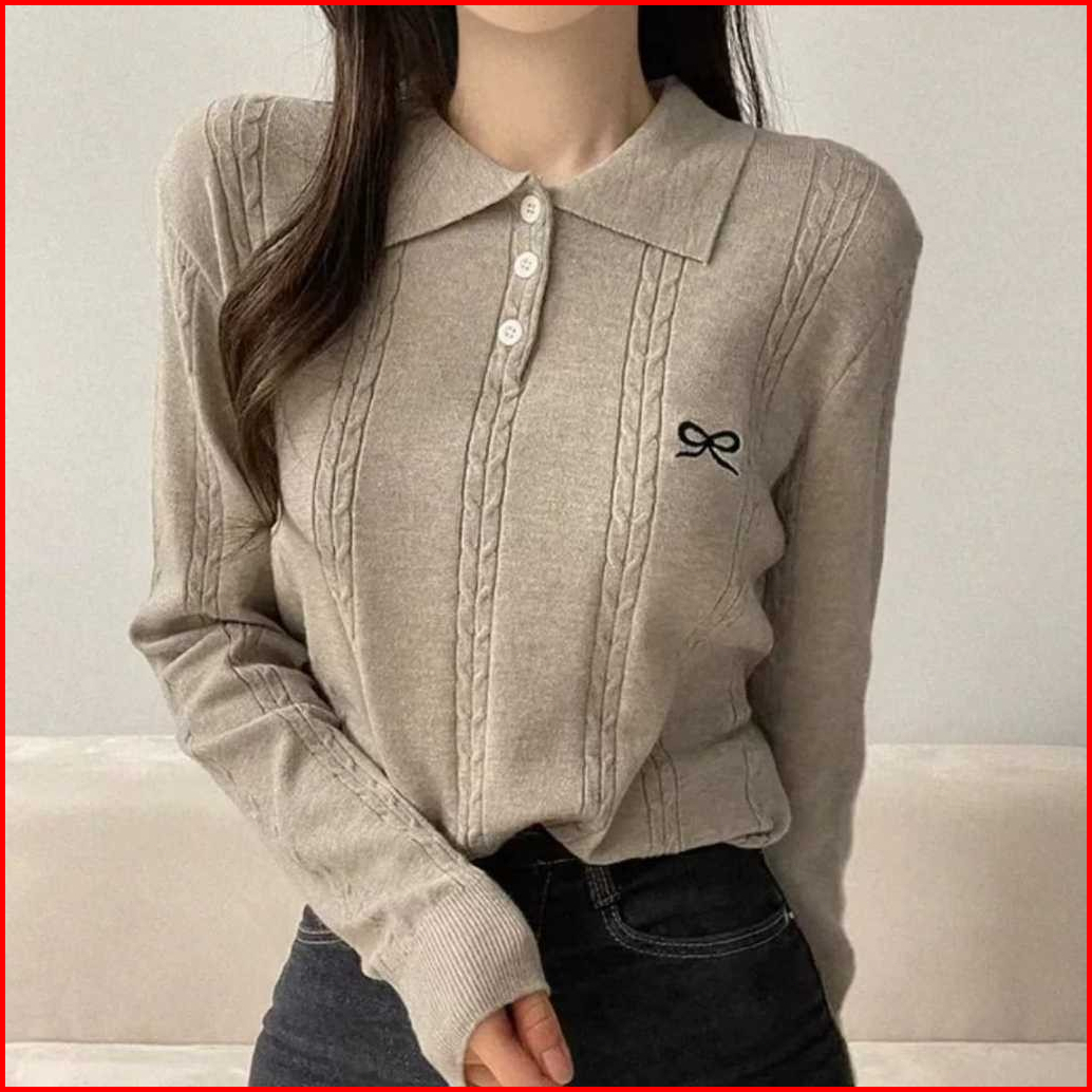 Avanue.outlet D07 Sweater Rajut Knit Wanita Kepang Bermotif Pita Lengan Panjang Kancing Hidup Korean Style