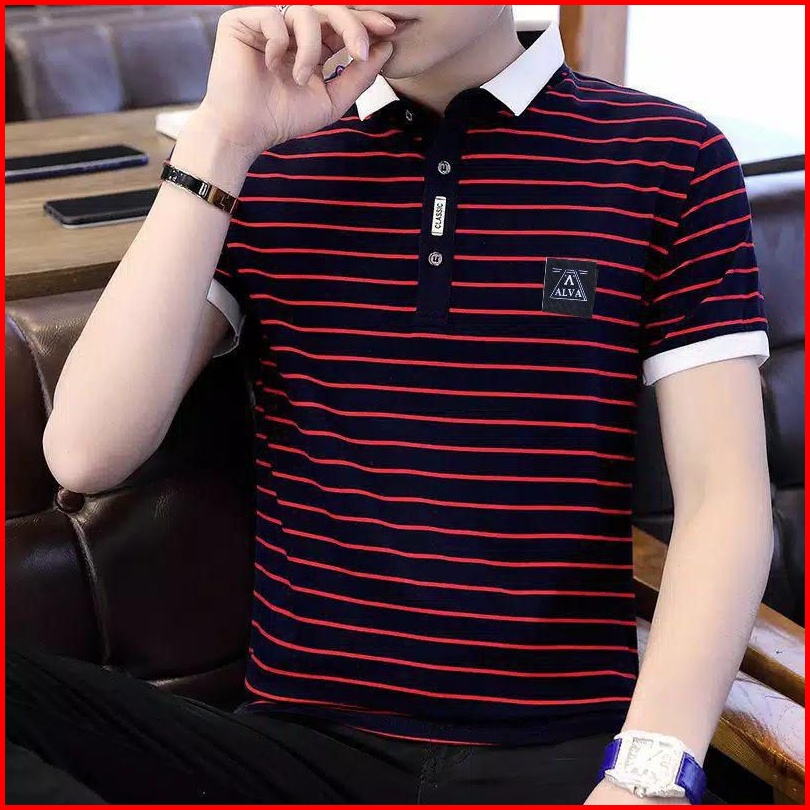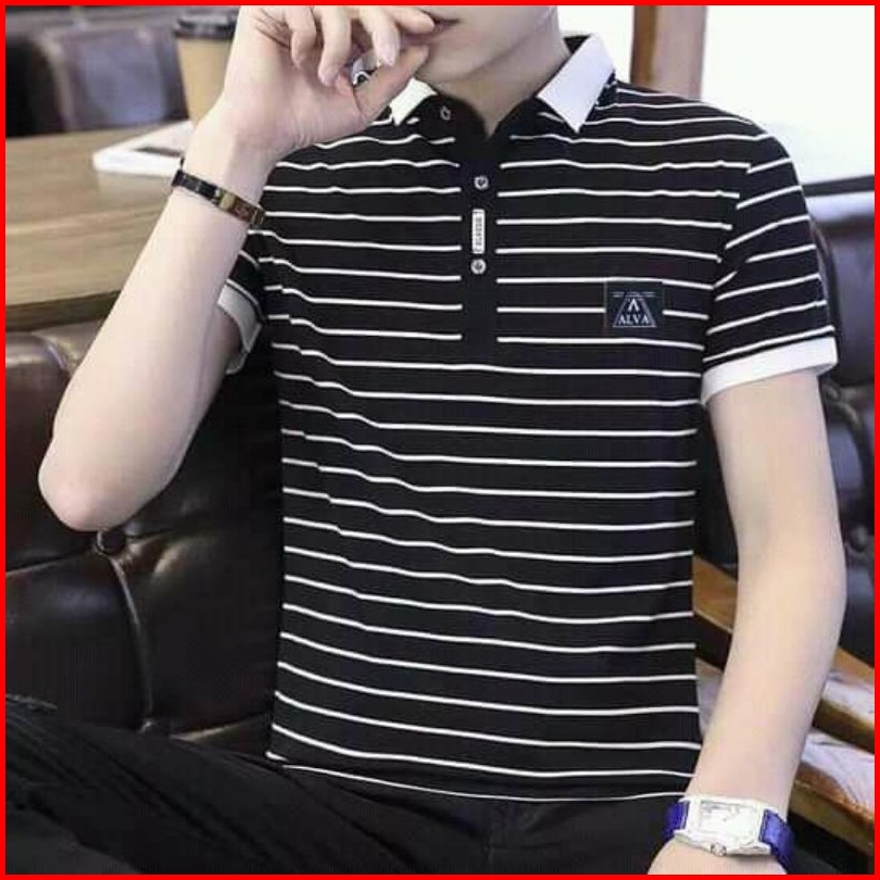 Terlariss Kaos Berkerah Distro Kaos Berkerah Motif Garis Casual Formal
