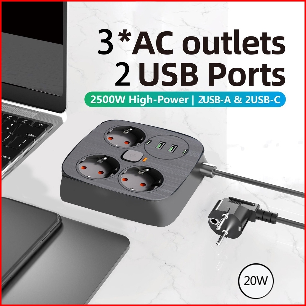 Niceme Stop Kontak 3 Lubang 2usb A 2usb C Kabel Fleksibel 2m 2500w Soket Multifungsi Listrik Garansi Resmi 12 Bulan