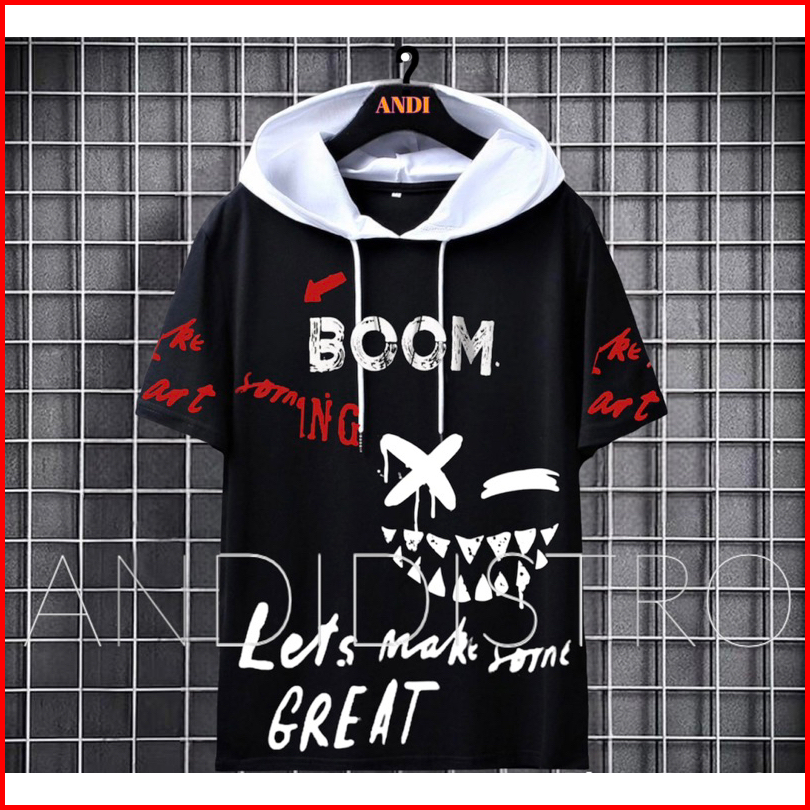 Kaos Hoodie Pendek Sablon Boom Motif Kombinasi Hitam Putih