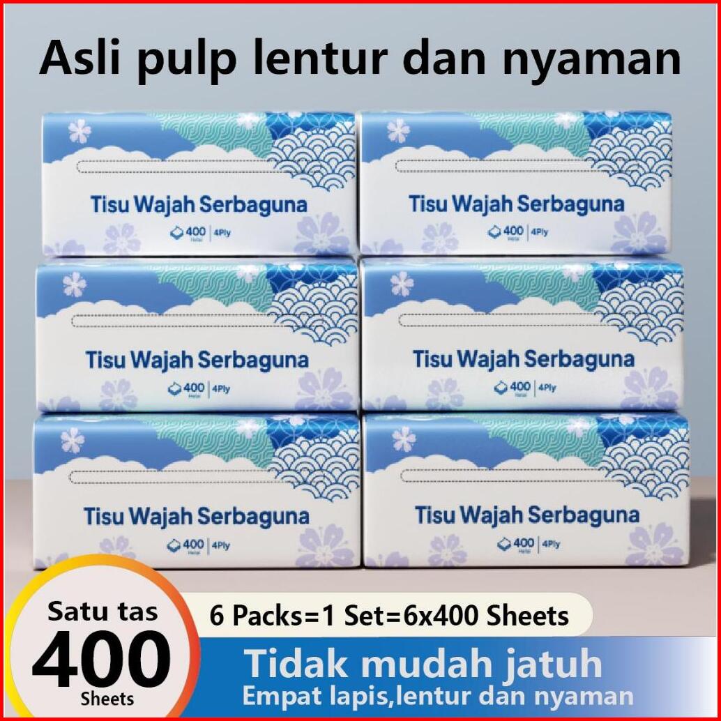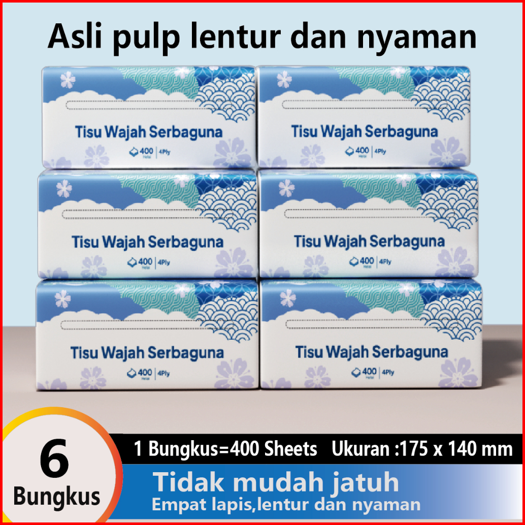 Dinomi Tisu Wajah Classic Dipertebal 4 Lapis 400 Lembar Per Pack Asli Pulp Lentur Nyaman 140x175mm 6 Pack Size L