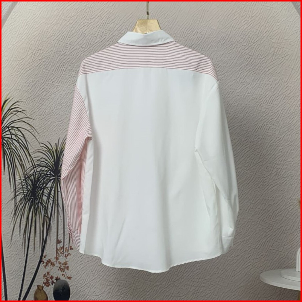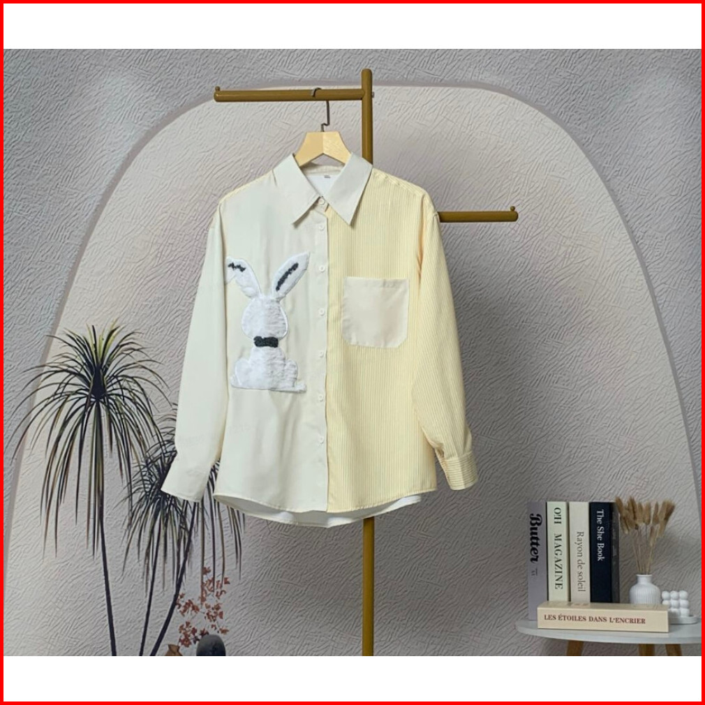 Kemeja Wanita Oversize Desain Asimetris Dengan Motif Kelinci Imut Dan Garis-garis Atasan Lengan Panjang Kasual Pakaian W