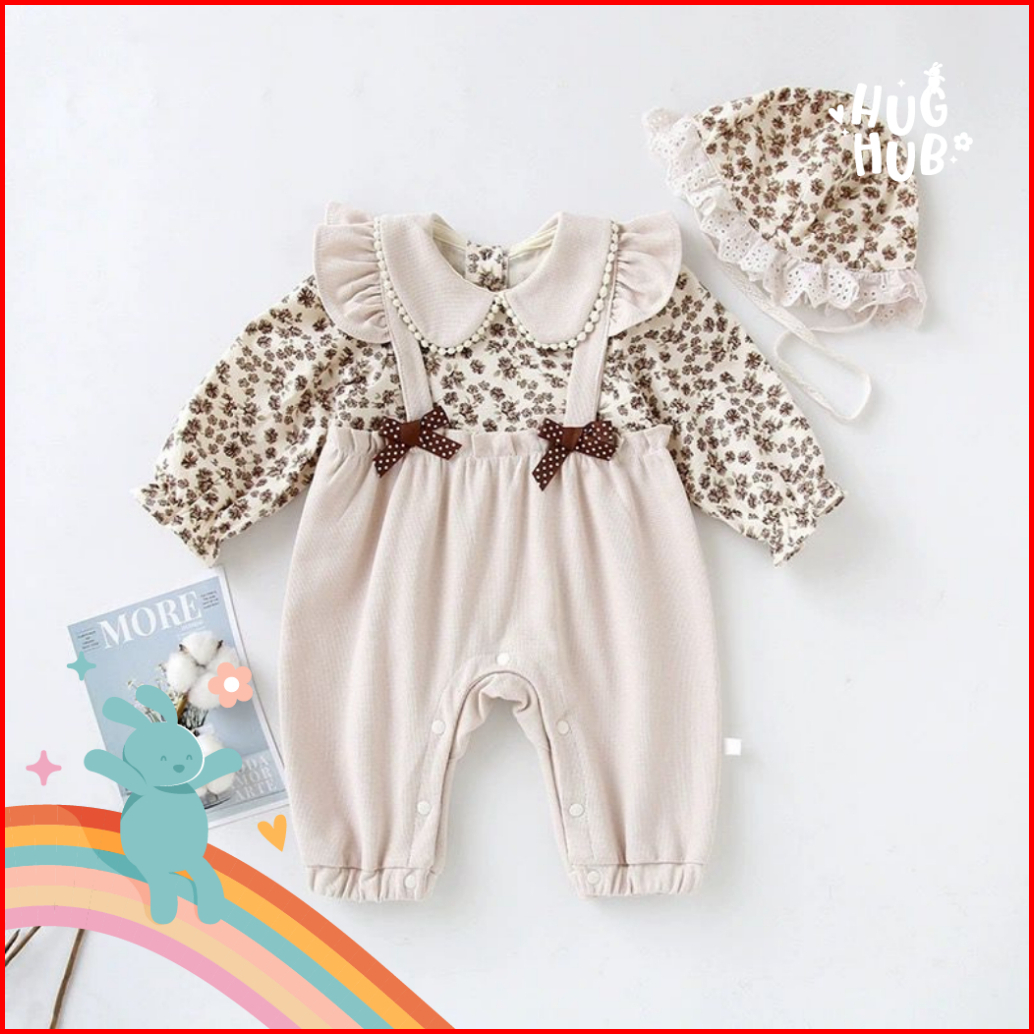 Hughub Jumper Bayi Perempuan Usia 3-12 Bulan Jumpsuit Bunga Pita Cokelat Dan Topi Kupluk Premium