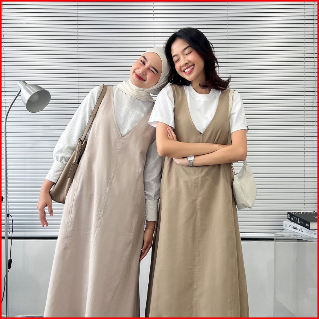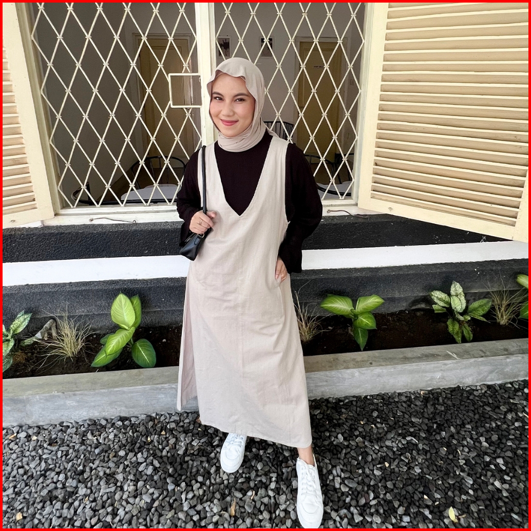 Yeppuoutfit - Hyewon Overall Basic Long Dress Simple V Line Tanpa Lengan Bahan Linen Twill