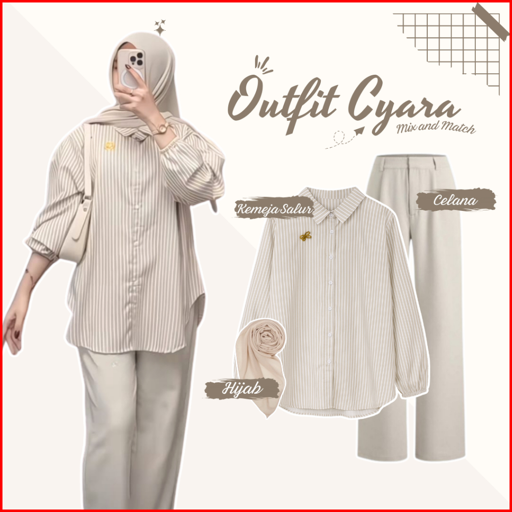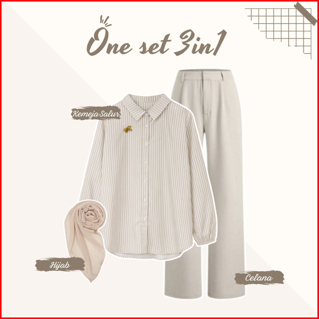 Setelan Wanita Bangkok Style One Set Blouse Kemeja Salur Cream Celana Hightwaist Hijab Am210n