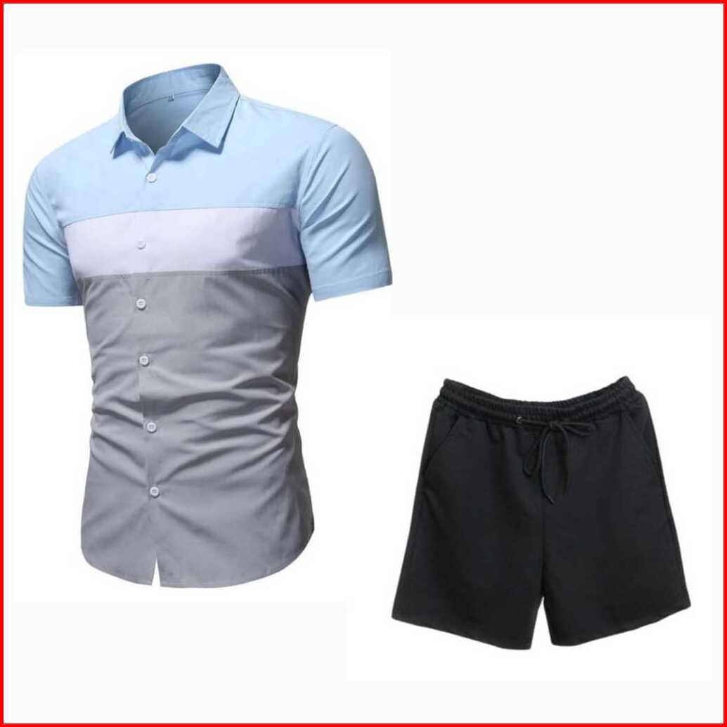 Setelan Kemeja Kombinasi 3 Warna Lengan Pendek Dan Celana Pendek Pria
