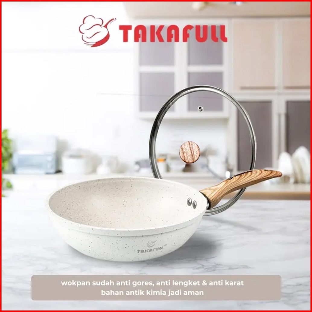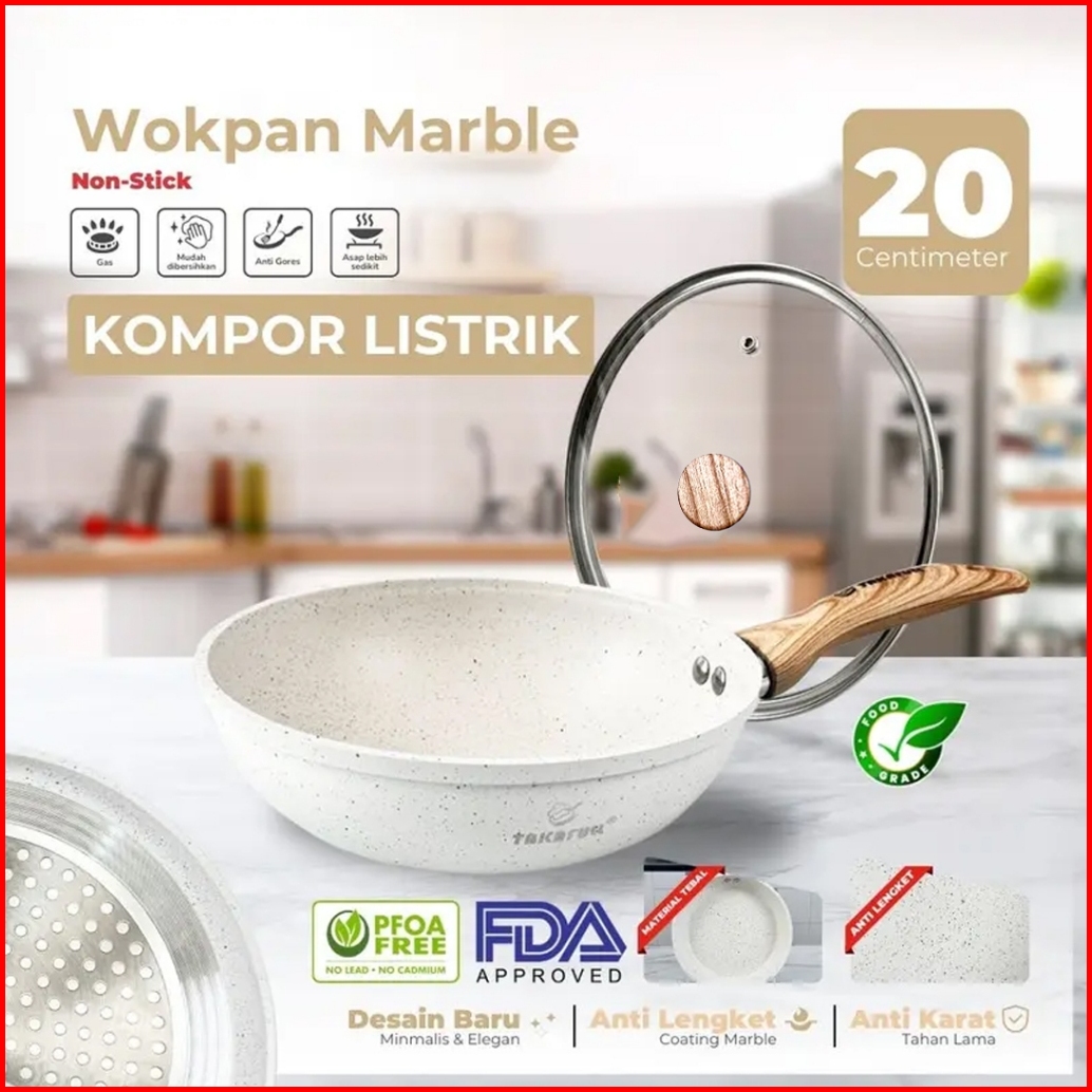Takafull Wajan Cekung Penggorengan 20cmmarble Coating Anti Lengket Gagang Motif Kayu Tutup Kaca