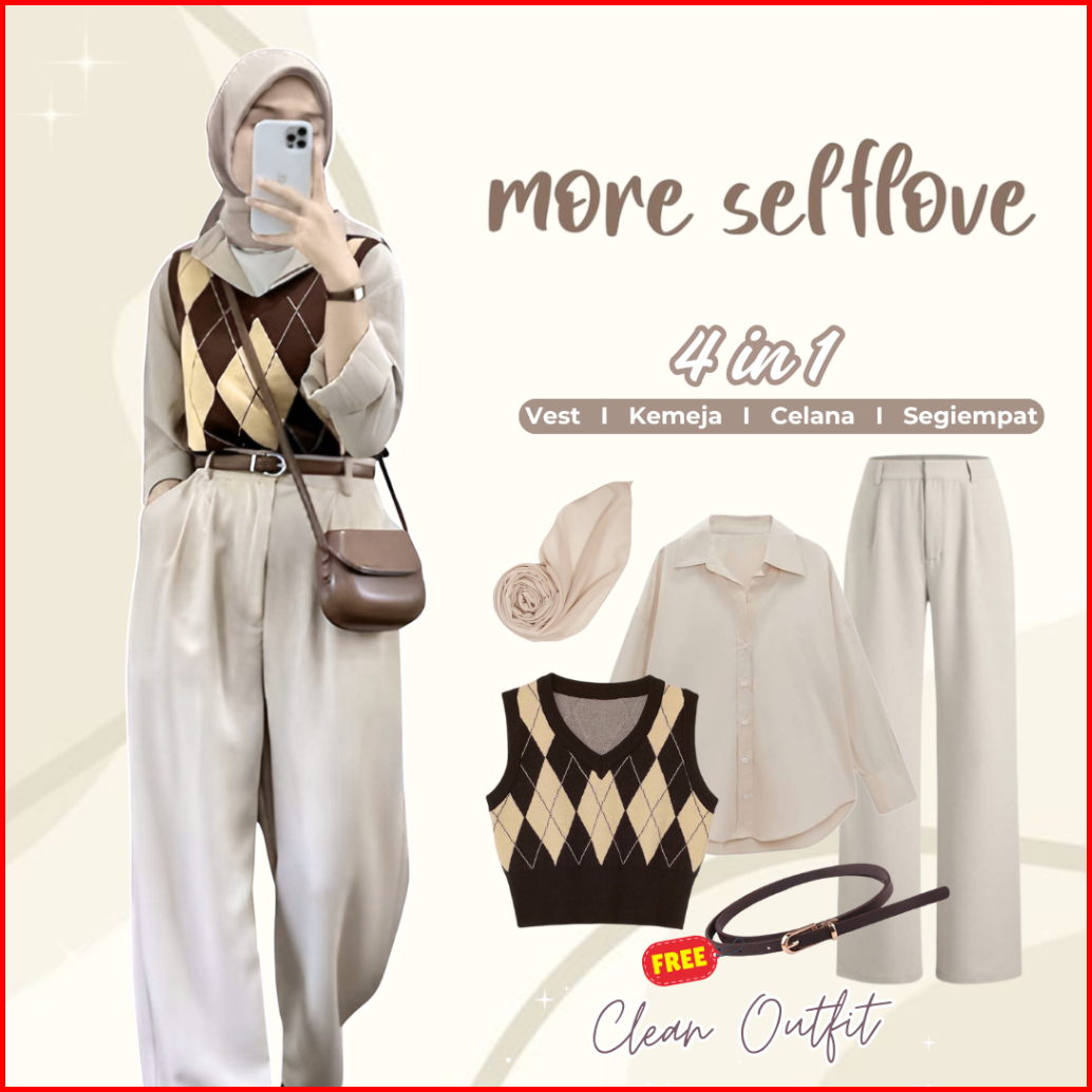 One Set Korean Style 4in1 Vest Kemeja Celana Bella Square Outfit Hijab One Set Hijab Ootd Kekinian L14n