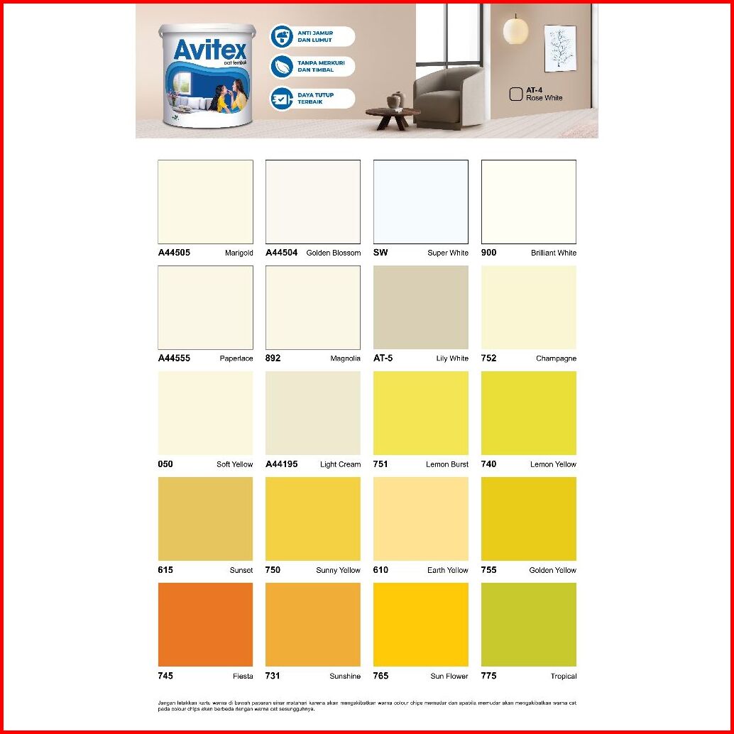 621 Cool Lime, 818 French mint, 760 Fresh Mint, 710 Moon Glow, 260 Green Bay, 650 Sweet Pink, 620 Apple Green, 776 Telur Asin, 602 Skyway, 720 Candy Pink, 770 Emerald, 712 Telur bebek, 601 Blue Romance, 725 Cherry Pink, 772 Templation, 711 Aqua Marine, 600 Blue Harmony, 735 Bright Red, 771 Kiwi Gold, 700 Azure Blue, 660 Lilac Frost, 661 Royal Purpel, A44505 Marigold, A44504 Golden Blosso, SW Super White, 900 Brilliant White, A44555 Paperlace, 892 Magnolia, AT-5 Lily White, 752 Champagne, 050 Soft Yellow, A44195 Light Cream, 751 Lemon Brust, 740 Lemon Yellow, 615 Sunset, 750 Sunny Yellow, 610 Earth Yellow, 755 Golden Yellow, 745 Fiesta, 731 Sunshine, 765 Sun Flower, 775 Tropical, A1501 Putih, 896 M.White, A44475 Putih Laguna, A40553 Cascade, 093 Ash Grey, 893 Powder Violet, AT-1 Barley White, AT-4 Rose White, 246 Pearl White, 670 Artic Silver, 816 Illusion, 831 Light Cream, 040 Cream, 671 Midnight, PS-8 Smiley, 812 Flamingo, 522 Apricot, 675 Modern Grey, 630 Tangerine, 730 Orange Juice, 680 Safari, SB Super Black, A44544 Chrysan White