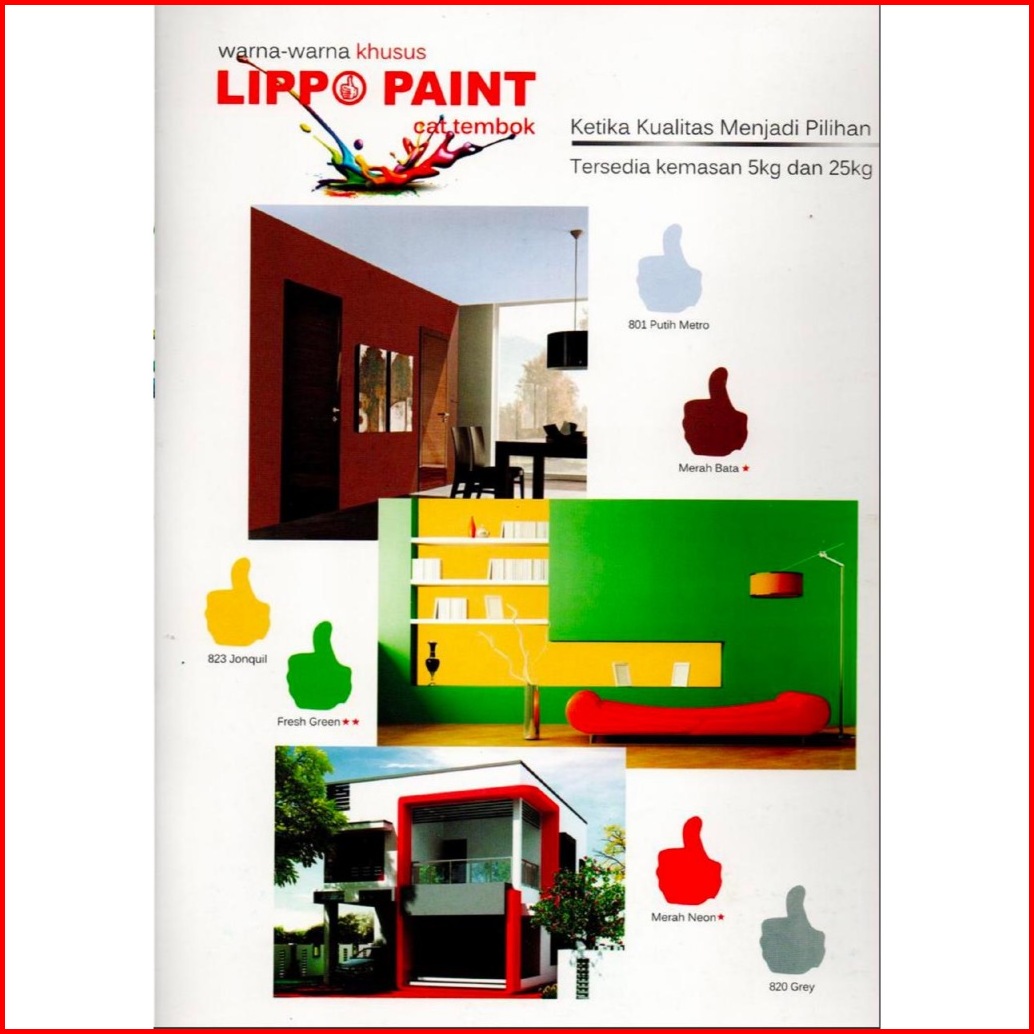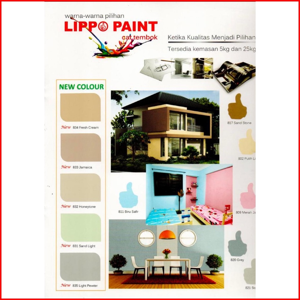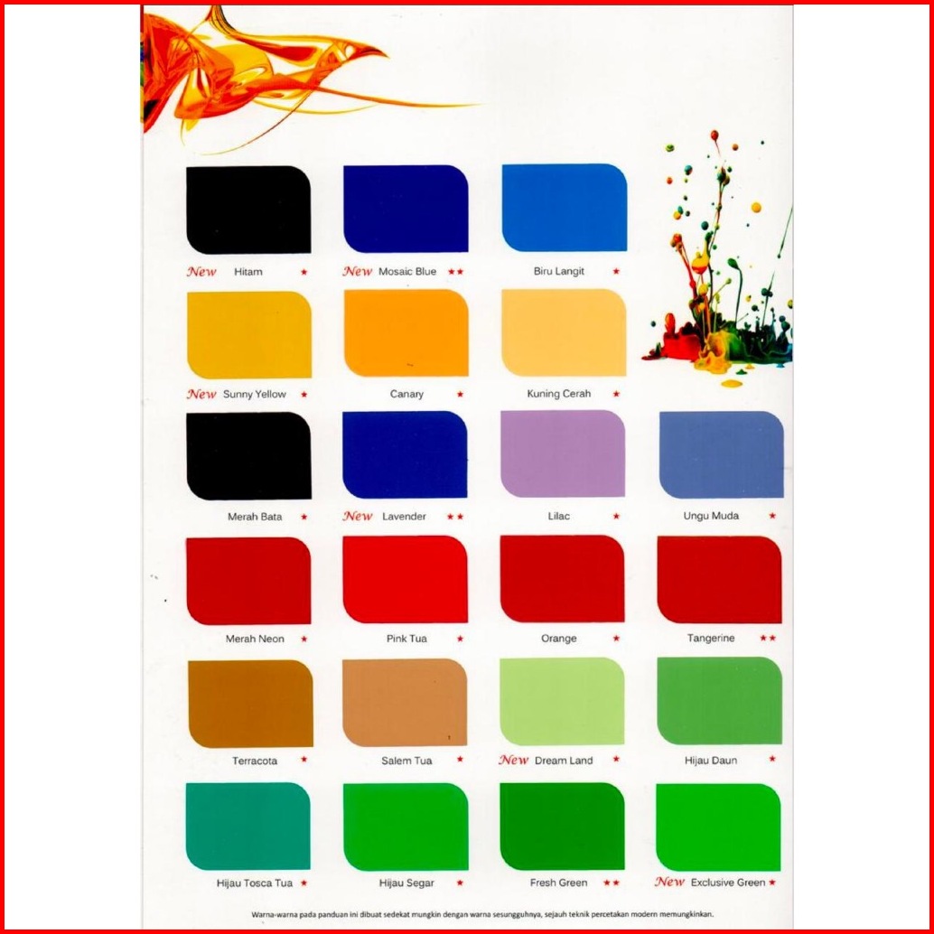 Putih Bersih, 801 Putih Metro, 802 Putih Lily, 803 Kuning Gading, 804 Kuning Terang, 805 Hijau Apel, 806 Hijau Alpukat, 807 Hijau Tosca, 808 Salem, 809 Merah Jambu, 810 Cream, 811 Biru Safir, 812 Biru Laut, 814 Biru Muda, 816 Carita, 817 Sand Stone, 818 Chinos, 819 Platinum, 820 Grey, 821 Stone, 822 Holiday Blues, 823 Jonquil, 825 Ina Grey, 827 Kuning Millenium, 828 Paminda, 829 Scottish Pink, 830 Biru Bulan, 831 Sand Light, 832 Honeytone, 833 Jamaica, 834 Fresh Cream, 835 Light Pewter, Hitam (New) ⭐, Biru Langit ⭐, Sunny Yellow (New) ⭐, Canary ⭐, Kuning Cerah ⭐, Lilac ⭐, Ungu Muda ⭐, Pink Tua ⭐, Orange ⭐, Terracota ⭐, Salem Tua ⭐, Dream Land (New) ⭐, Hijau Daun ⭐, Hijau Tosca Tua ⭐, Hijau Segar ⭐, Exclusive Green ⭐, Merah Neon ⭐, Merah Bata ⭐, Mosaic Blue New ⭐ ⭐, Fresh Green ⭐⭐, Tangerine ⭐ ⭐, Lavender (New) ⭐ ⭐