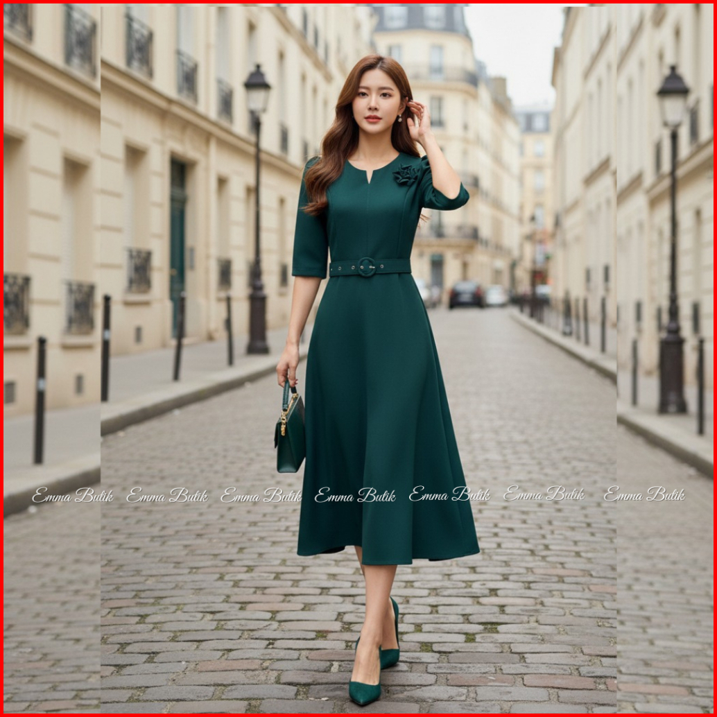 Emma.butik E00627 Gaun Midi Wanita Cantik Dress Loma Polos Kasual Maroon Natal Gereja Hijau