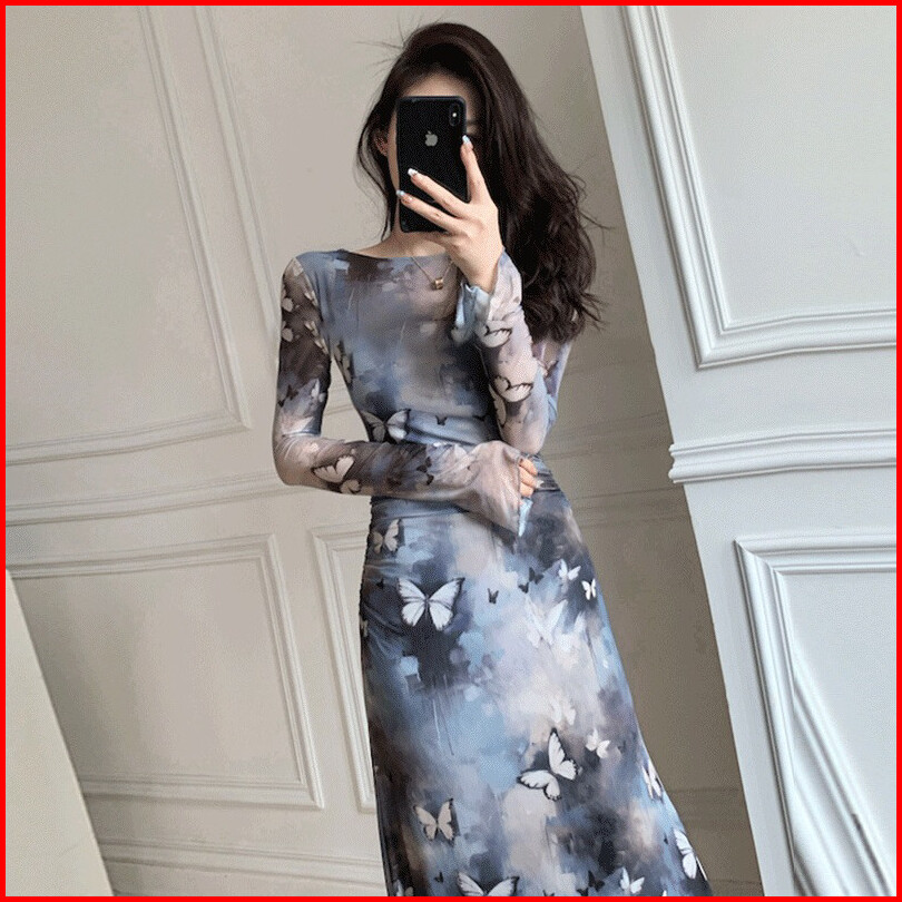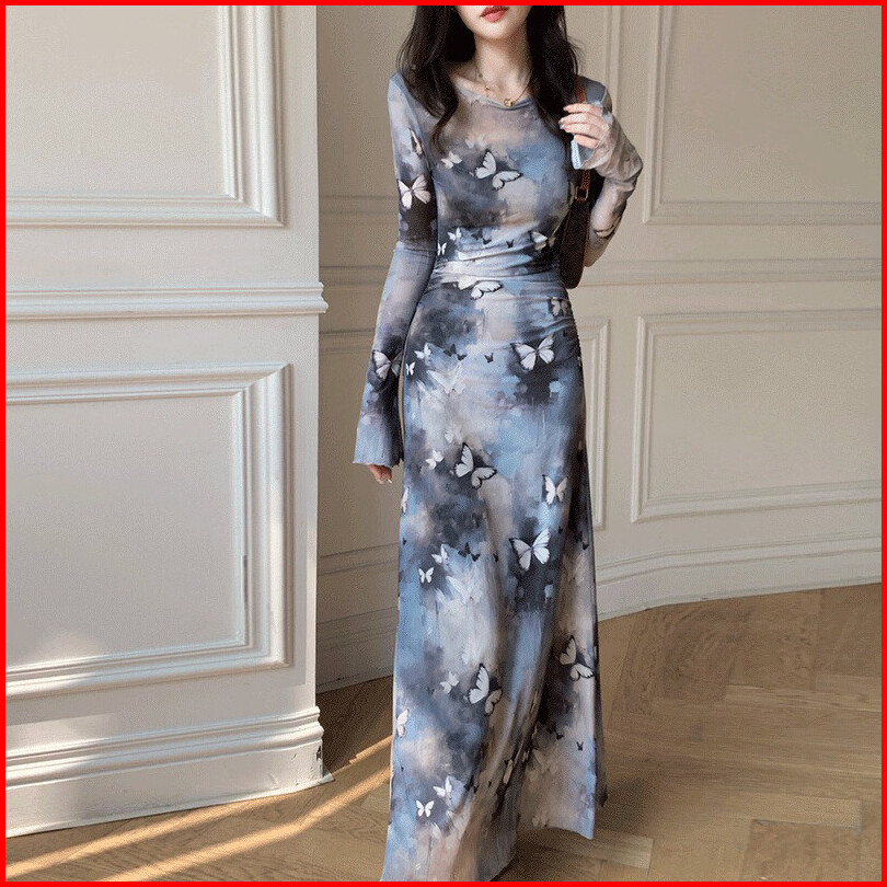 9194 Gaun Retro Pinggang Ramping Bermotif Kupu Kupu Gaun Bunga - G047