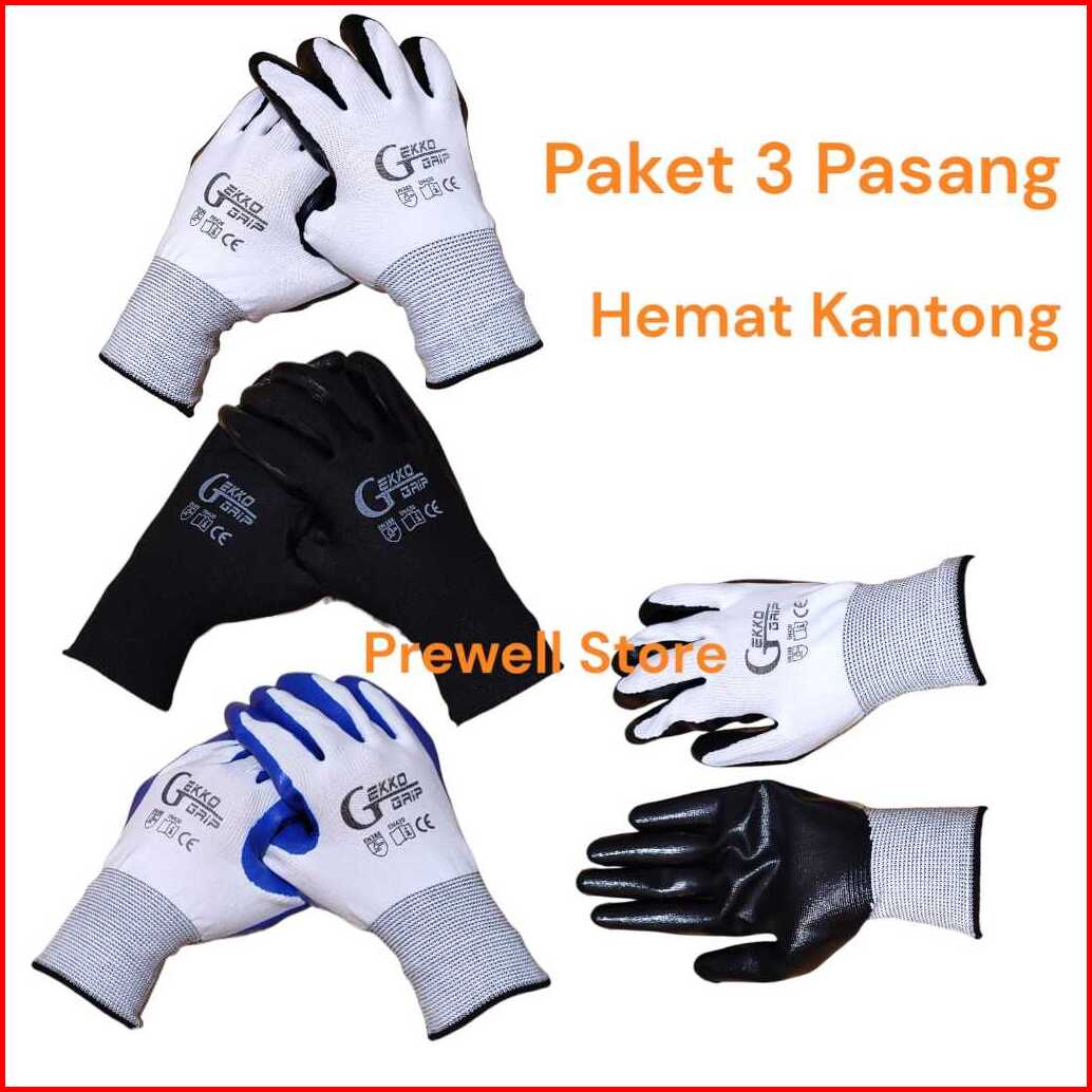 Paket 3 Pasang Sarung Tangan Kerja Proyek Safety Glove Premium Karet Anti Slip Tebal Dan Kuat