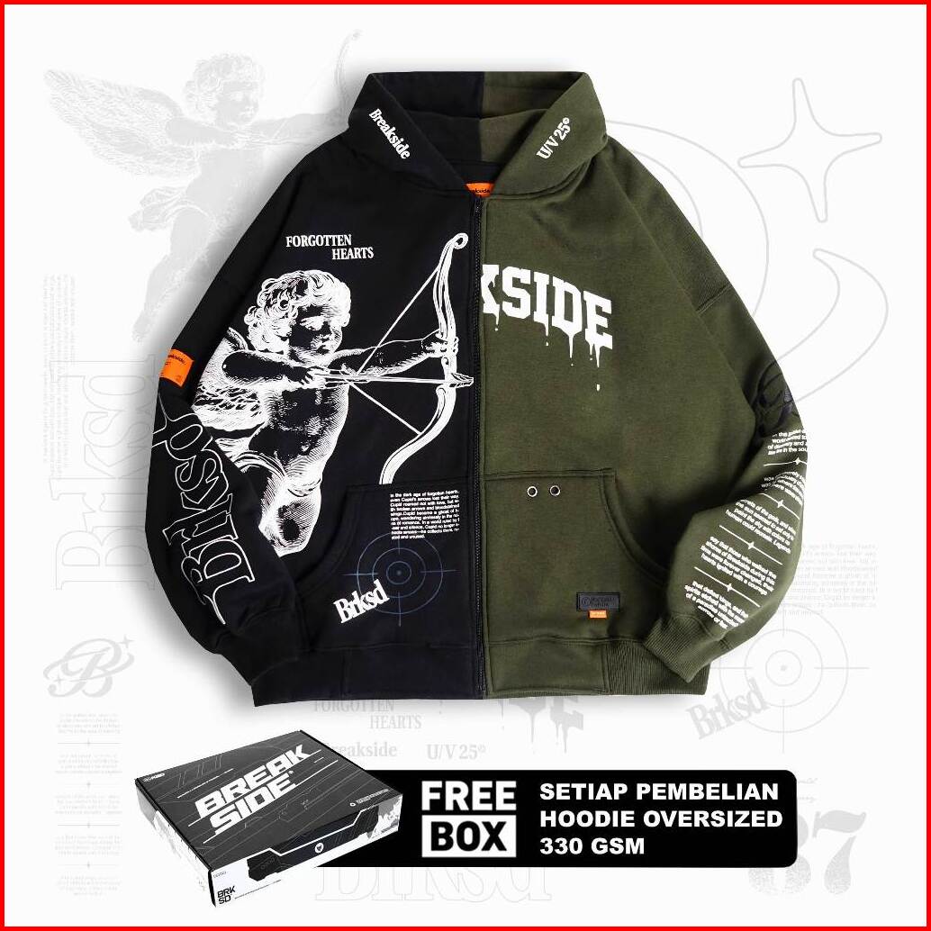 Free Box Breakside Zipper Hoodie Oversized Forgotten Hearts - Black Green Sweater Pria